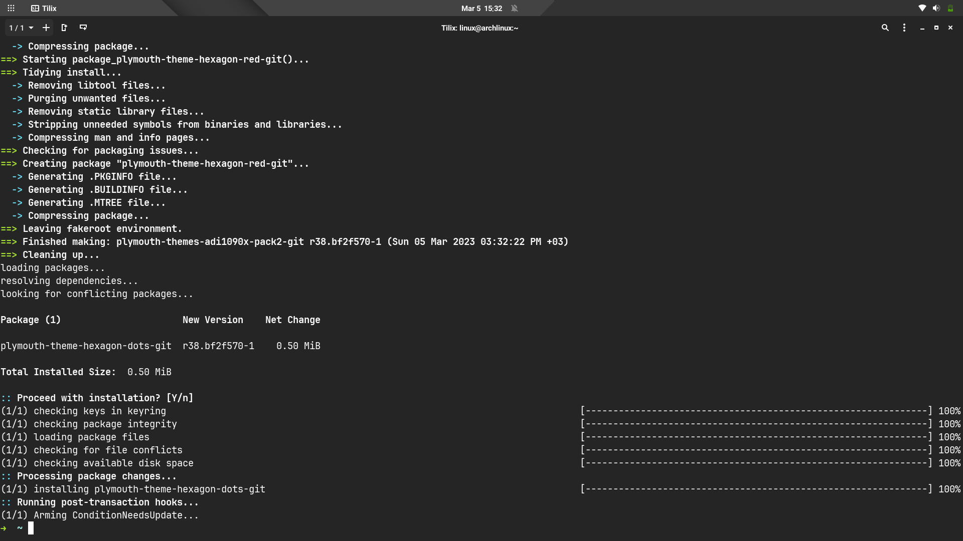 Bu tema AUR'da paket olarak bulunduğundan paru -S plymouth-theme-hexagon-dots-git komutu ile kurdum.