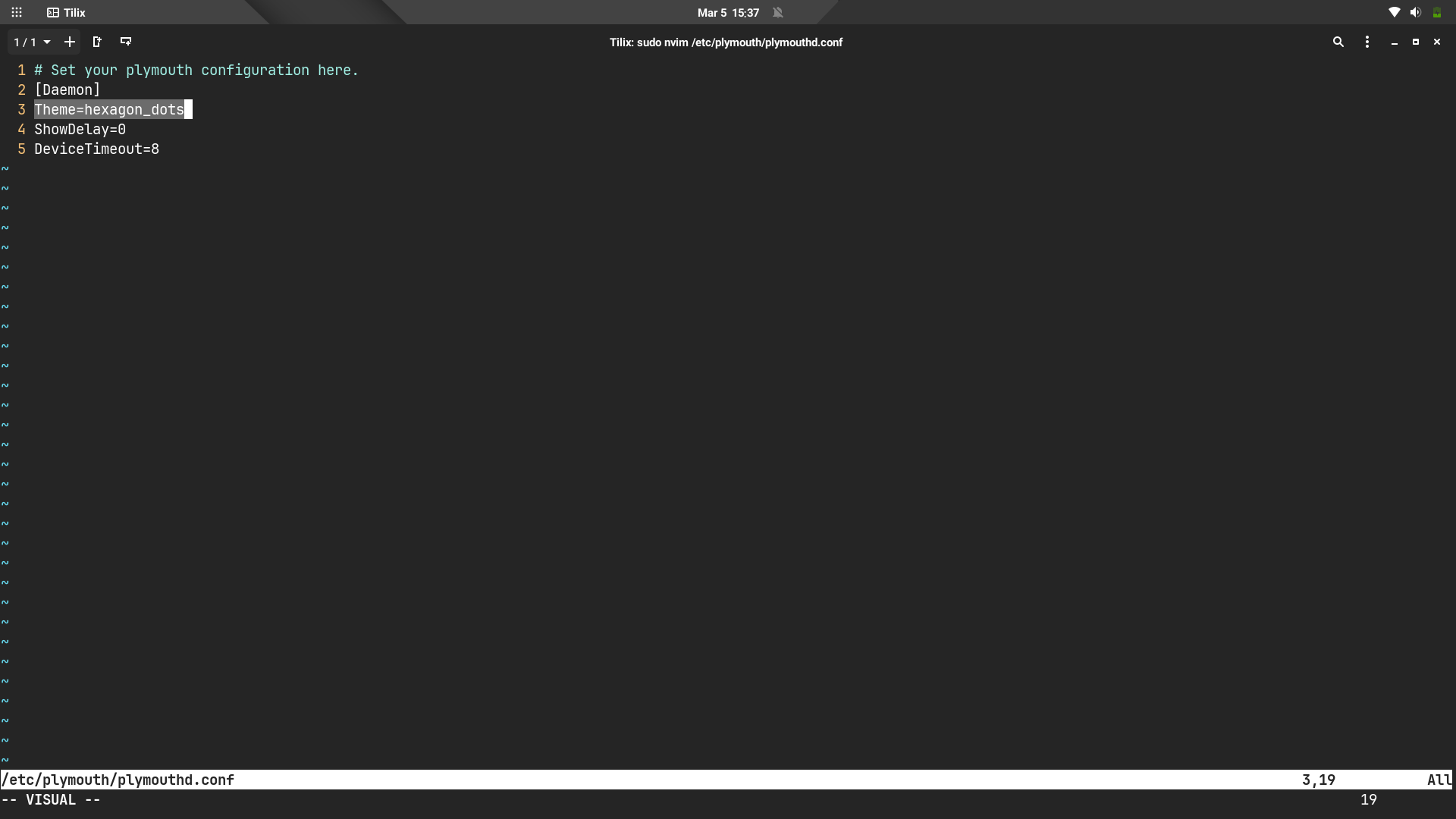 /etc/plymouth/plymouthd.conf dosyasını root yetkilerle istediğiniz yazı düzenleyicisi ile açın.