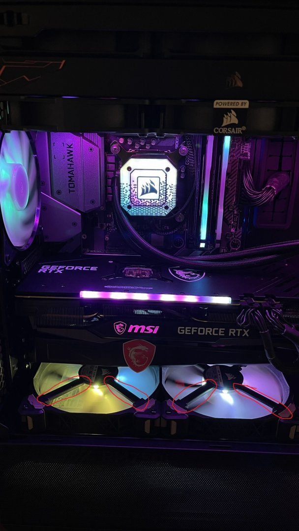Arkadaşlar merhaba eklediğim resimlerdeki ekran kartımın altındaki fanları değiştirmek istiyorum. O takılı olanlar fanlar Corsair ML140 eski soğutucumdaki fanlardı. Şikayetim o fanları içeri hava üfleyecek şekilde taktığımda motorunu tutan siyah ayakların gözükmesi ve aşırı ses yapıyor. Sıvı soğutucuda Arctic P12 PWM pst ARGB modeli mevcut. Arka egzoz fanımı da bu modelin 140mm olanını alacağım. Ekran kartımın altındakileri de aynı model almak istiyorum ancak ters fan diye bir şey var mı? Yani havayı içeri doğru üfleyecek ama o siyah ayaklar gözükmeyecek pervanesi üstte kalacak. Resimde bahsettiğim siyah ayakları belirttim.