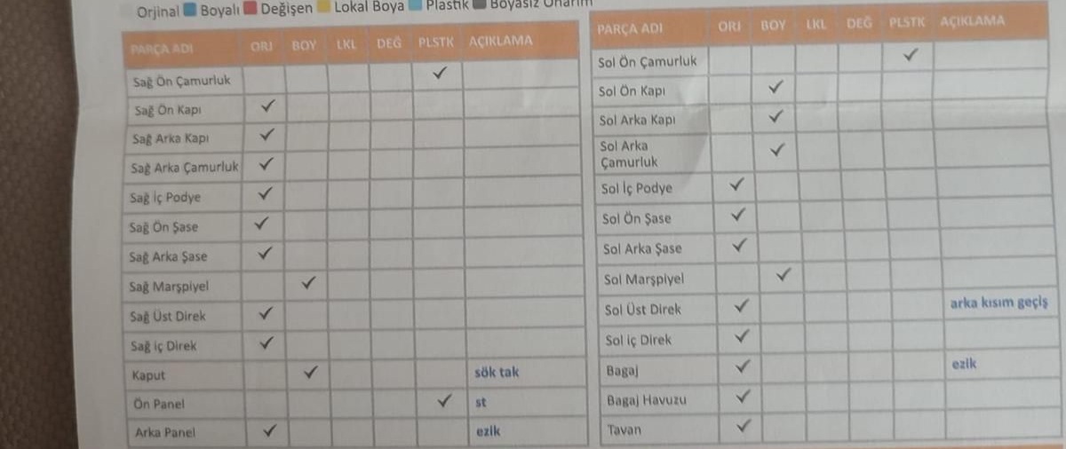 Teşekkürler. Aracın kaput sol ön kapı sol arka kapı ve sol çamurluk boya onun dışında bir işlem olmadığını söyledi. Fakat kaput sök tak boya.
