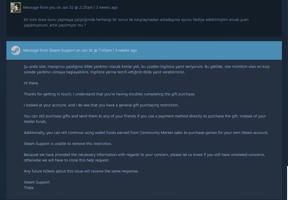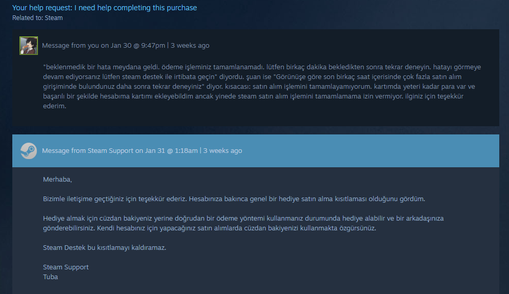 Selamlar, bundan yaklaşık 4 hafta önce a isimli arkadaşıma hediye göndermeye çalıştım anca Steam buna izin vermedi(hatayı aşağıdaki fotoğraftan görebilirsiniz). Steam supporta gittim ticket açtım "hesabınıza bakınca genel bir hediye satın alma kısıtlaması olduğunu gördüm" dedi(detaylı ticket fotoğrafları aşağıda). Her neyse ben de vazgeçtim artık ondan sonra aradan 1 hafta geçti ve b isimli arkadaşıma hediye etmeye çalıştım ve bir sıkıntı yaşamadan tek seferde hediye edebildim. Şu anda tekrardan ticket açtım, bunun dışında yapabileceğim bir şey var mı? Kısacası a hesabına hediye gönderemiyorum.