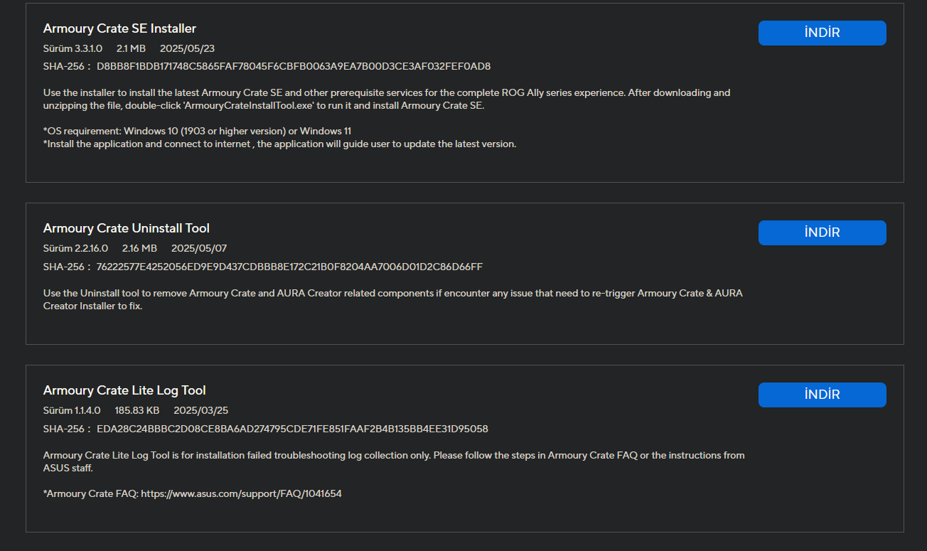 Oldu hocam teşekkürler.Armoury Crate - Destek hocam şurada aşağıda