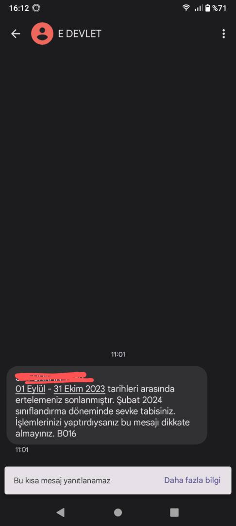 Arkadaşlar askere başvurdum ve 27 Eylül'de sevk açıklamaları yapıldı ama ben bu kapsama girmedim şimdi şöyle bir mesaj geldi resim olarak da eklerim resme bağlı olarak benim sonuç Şubat'ta mı açıklanacak yoksa şubat'ta gitme ihtimalim mı var?