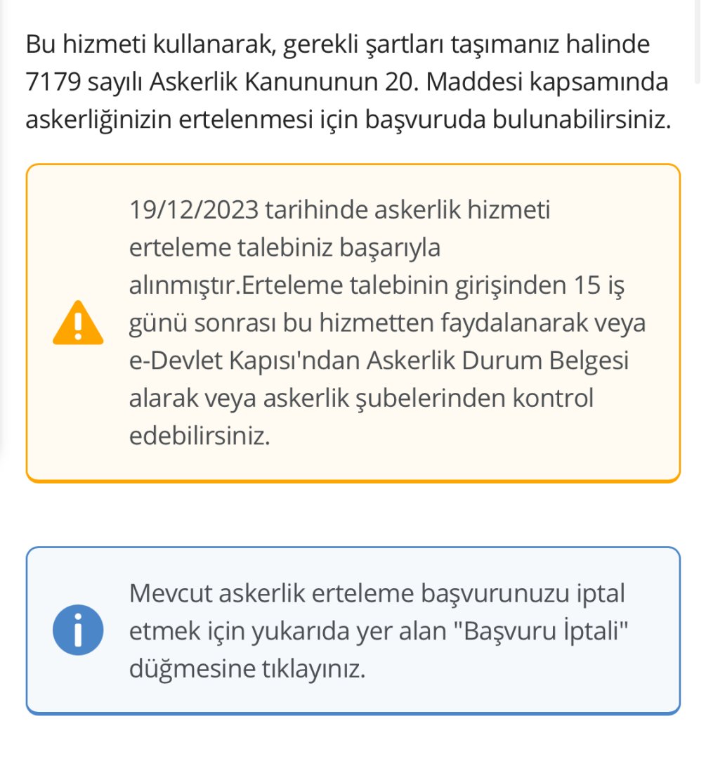 Bugün askerliği tecil ettirmeye gittim. Belgemi verdim. Oraya yazı asmışlar şunları e-Devlet'ten yap diye. e-Devlet'ten askerliğimi erteletmek istiyorumu seçtim. Karşıma yeşil tikli bir mesaj sayfası çıktı. “15 gün… “ diye başlayan yazı çıktı. Şu an ne yazdığını unuttum. Kadına gösterdim. 15 gün içinde olacak mı dedi ne dedi çok dikkatle dinlemedim, unuttum. İşiniz tamam dedi. Şimdi tekrar e-Devlet'ten girdim. Hala daha yoklamanın tamamlamanız için kalan gün süresi 12 gün yazıyor. Altında da hala askerlik yapacağım ve tecil ettireceğim diye 2 seçenek var. Şimdi hemen alttakini seçip denemedim ne olur ne olmaz diye konu açayım dedim. Bilgilendirirseniz sevinirim.