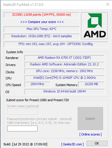 Sana sonucun kötüymüş diyen varsa benimkini at FurMark Online sonuç yerinde 3070'leri 3060 Ti'ları tokatlıyorum