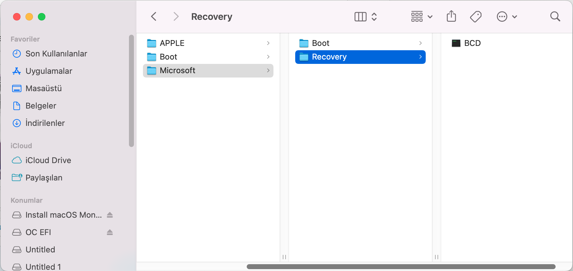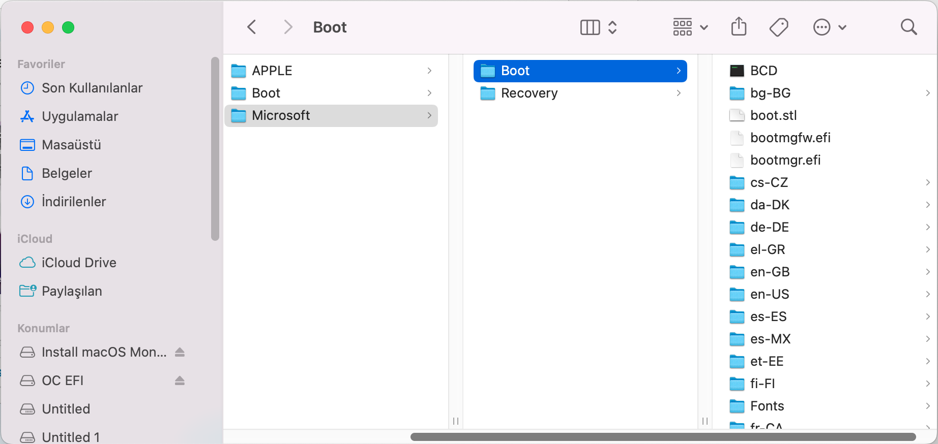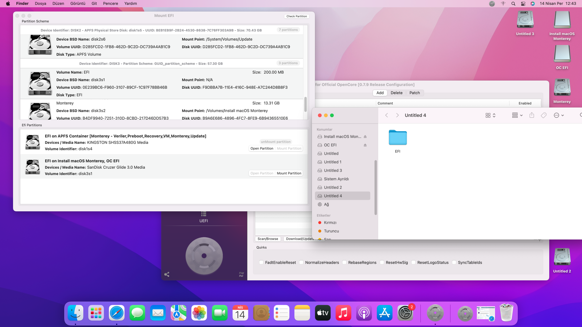 Untitled 4 label'i daha önce burada belirlediğim şekilde EFI idi. Gerçekten de OpenCore Configurator, Windows'un EFI bölümüne mi salça oluyor diye Windows'a geçip bu bölümün label'ini sildim. Ve şu an macOS'ta Untitled 4 olarak karşıma çıktı.