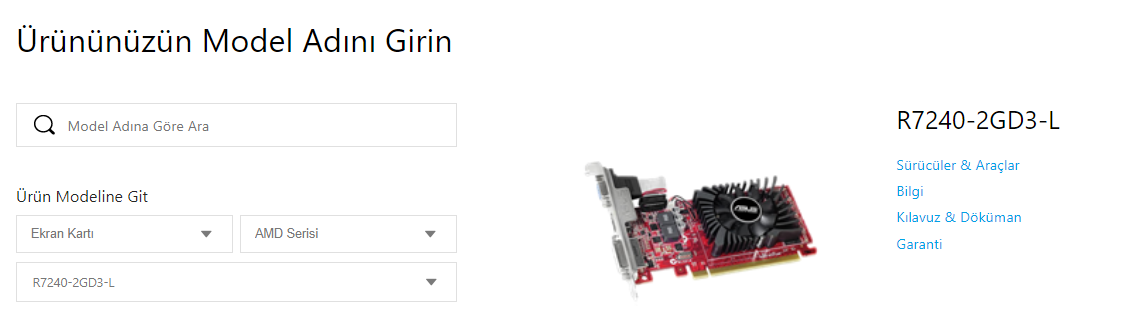 AMD'ye baktığımda sadece R7 240 Vardı R7 240 - L yoktu ve sonra aylarca yanlış bir driver kullandığımı öğrendim. Zaten Google'a AMD R7 240 yazdığımda fotoğraflarda benimkine benzer hiç kart yoktu ASUS'un sitesine girip arattığımda direkt olarak kartım karşıma çıktı