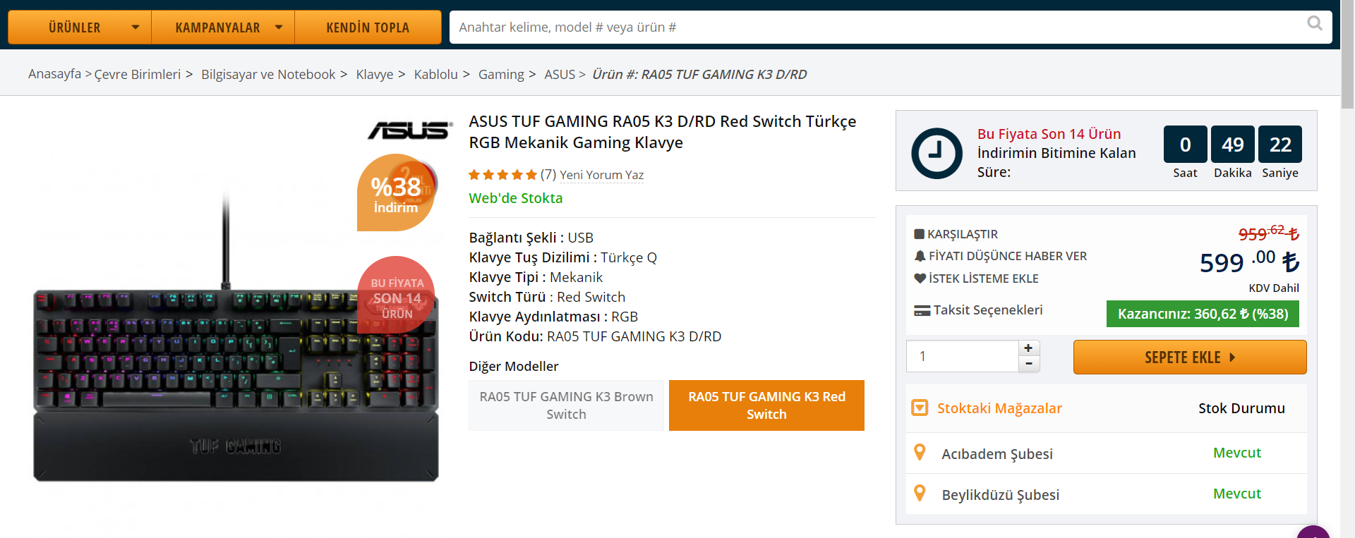 ASUS RA05 TUF GAMING K3 D/RD Red Switch Türkçe RGB Mekanik Gaming Klavye En iyi fiyat ve ödeme seçenekleri ile RA05 TUF GAMING K3 D/RD ITOPYA'da.