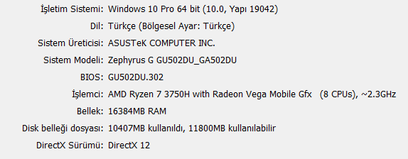 Kullandığım laptop modeli: ASUS ROG GA502DU-AL025.