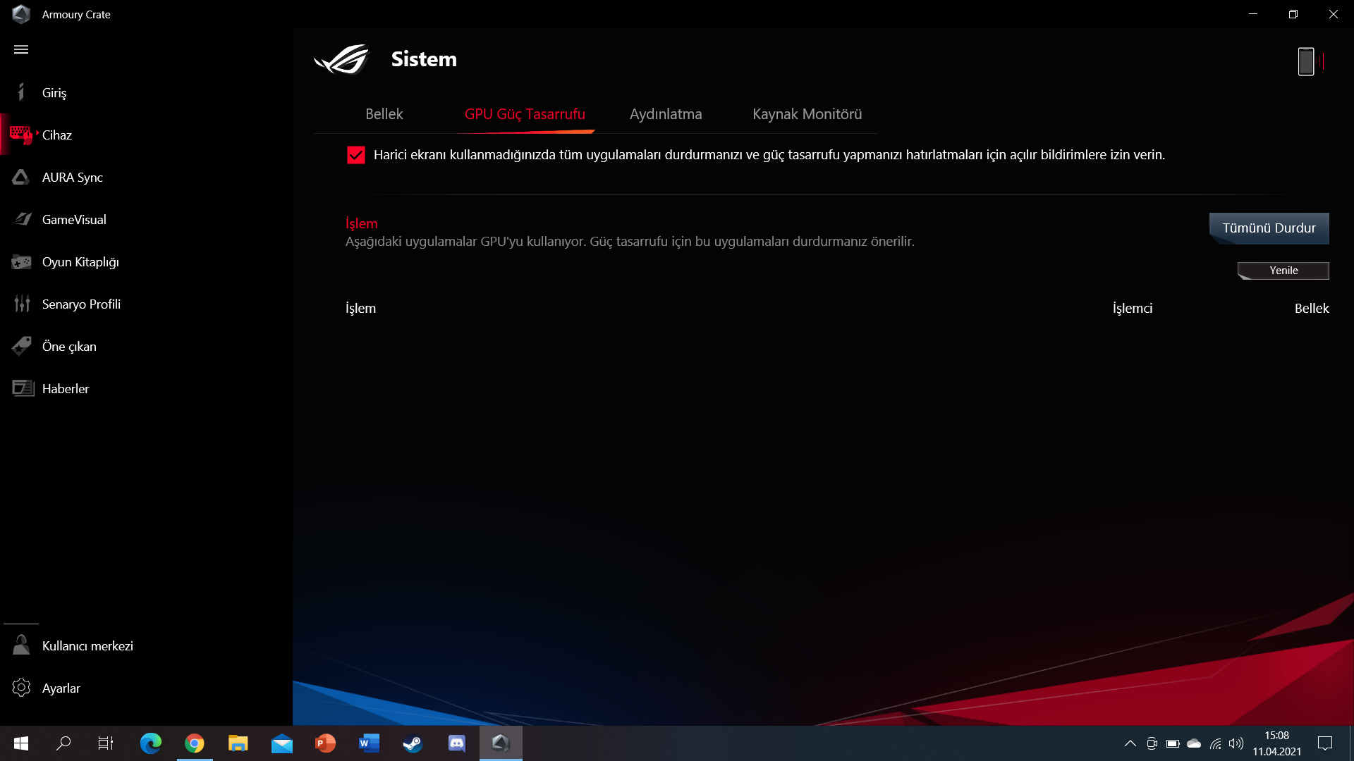 Merhaba. Laptop bir süredir boştayken GPU kullanıyor. Güç seçeneklerini dengeliye aldım ancak değişen bir şey yok. Armoury Crate yazılımında GPU kullanımı görüyorum ve düşük frekansta da olsa laptop fanlarının çalıştığını duyuyorum sürekli. Görev Yöneticisinde de sadece Intel'in kullanıldığı görülüyor.