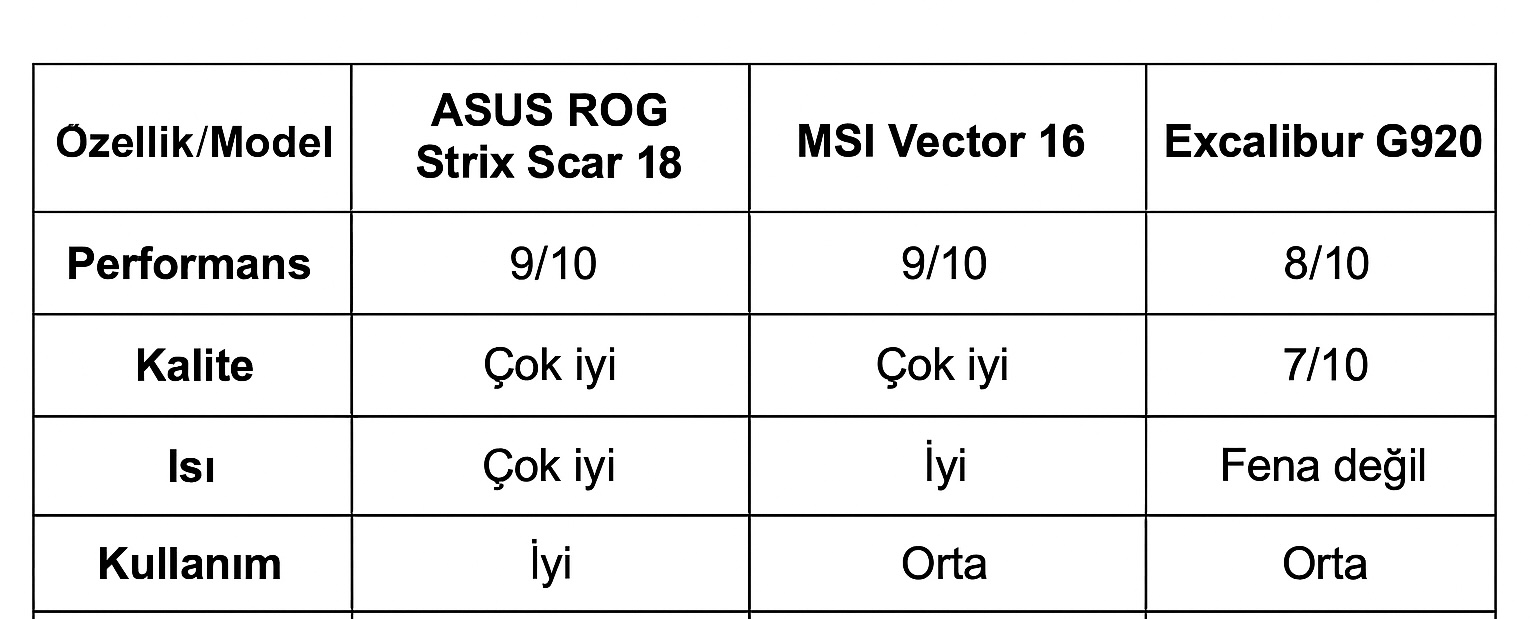 Excalibur'un soğutması yeter mi 5080/5090'a onu bilmiyoruz, Excalibur'un 40 serisi laptoplarında da ısınma sorunu yaşayan kullanıcılar vardı. Excalibur'un ayrıca kasa kalitesi maalesef MSI ve ASUS modellere kıyasla daha kötü yani ChatGPT soğutma ve kasa kalitesi konusunda doğru söylüyor hocam onları da göz önünde bulundurunuz. Hocam kıyaslamaları özetlemek gerekirse Excalibur 5090 + 300hz avantajına sahip ama diğer yönlerden kaybediyor. ASUS ve MSI ise performans ve yenileme hızı olarak bir tık düşük kalsa bile diğer özellikler bakımından daha gelişmiş ve kasa kaliteleri daha iyi. Bunları göz önünde bulundurursak Scar tercih etmeniz çok doğru olur ChatGPT güzel hazırlamış.