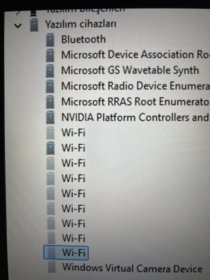 Ve olabilir mi problem buradan kaynakli? Driver 30 kere indirdim, eski driver da. Bu resimdeki yerdeki Wi-Fi yazisi duruyor ve kayboldugu anda Wi-Fi gidiyor, yukarida Realtek bakiyorum ama o calisir olarak gosteriyor ve ardinda onda da, calismiyor isareti geliyor.