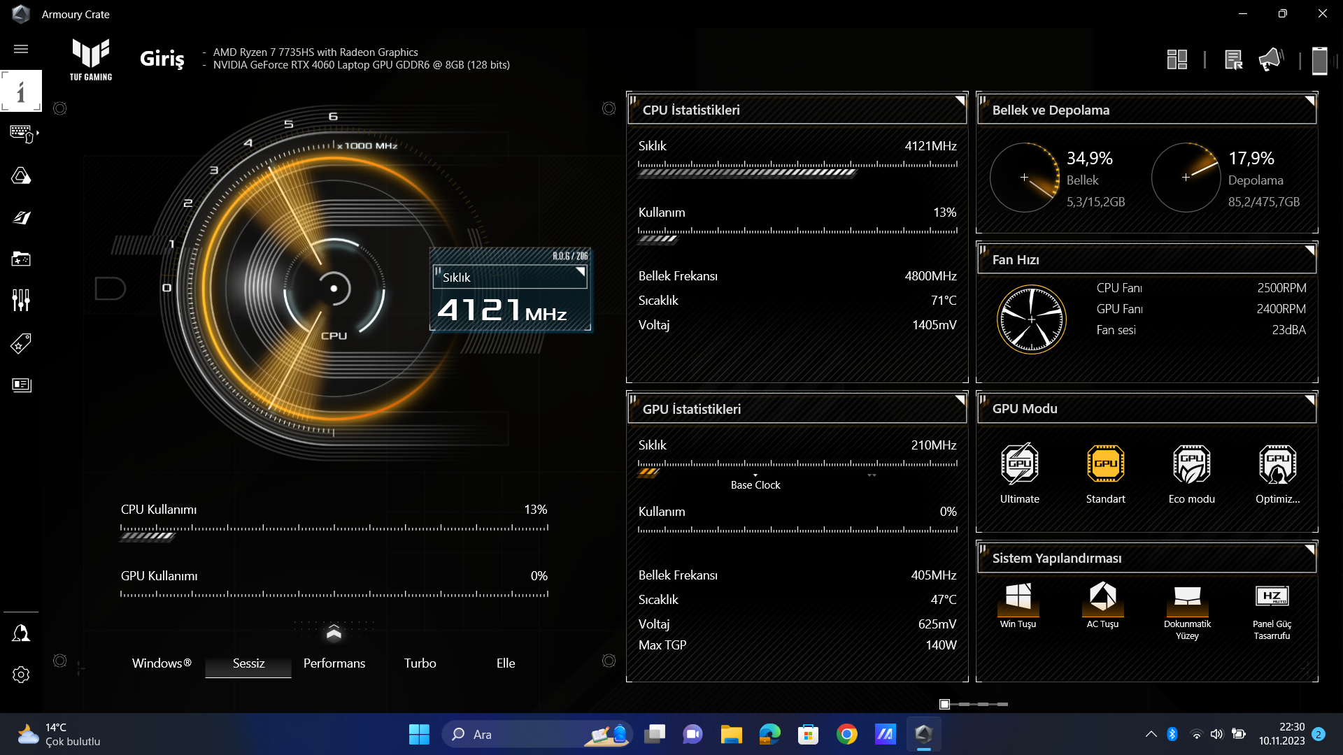 ASUS TUF A15 Ryzen 7735HS RTX 4060 laptopa sahibim. Adaptöre bağlı silent modda değerler bu şekilde. Fan çalışıyor yani MHz de yüksek gibime geldi. Pilde çalışırkende 55 60 derecelerde geziyor hiç 48 49 falan görmedim. MHz de 2.2-3.5 arası değişiyor. Bu değerler normal mi acaba cihaz 2 haftalık. GPU'da da masaüstünde vs AMD'ninki çalışıyor Armoury Cratedeki o değerler onun mu?