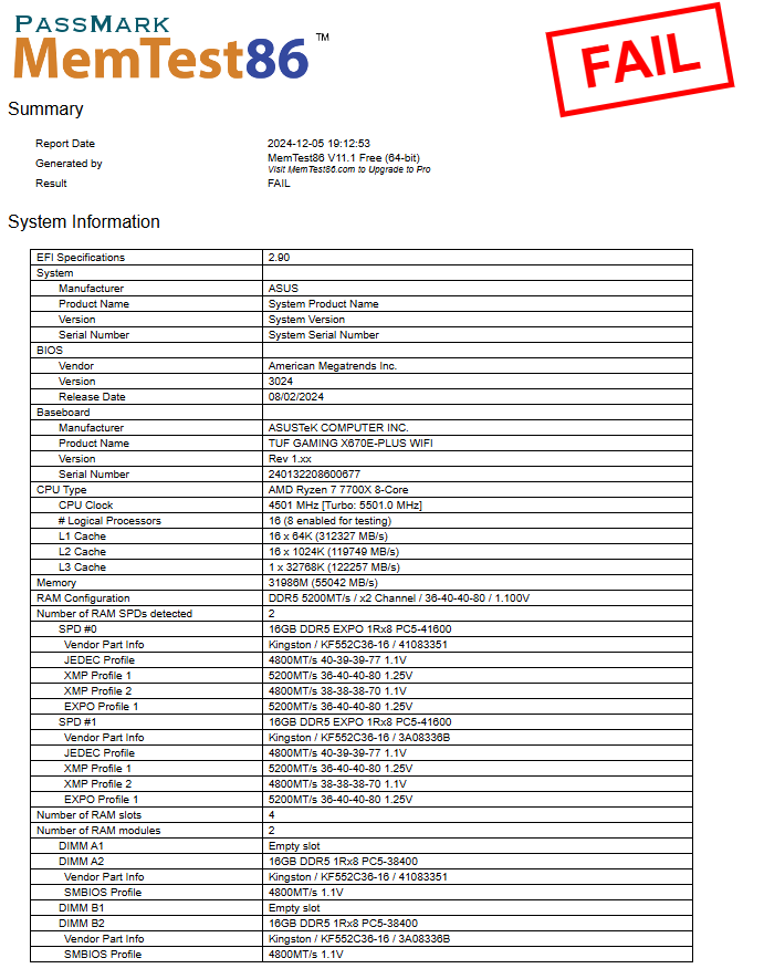 Hocamlar, ASUS TUF X670E Plus anakart, Ryzen 7 7700X işlemcim var halihazırda kullandığım 2x16 GB Kingston Beast 5200 MHz DDR5 RAM'lerim vardı. Mavi ekran hatası verdiğinden dolayı Memtest86 ya sokup hata olup olmadığını öğrendim. 10k hataya ulaşınca testi kapattı. Galiba 2 RAM'in hepsinde sorun var ve Memtest86'daki ifadeleri çok bilmiyorum. Bu yüzden yeni RAM alacağım ve önerilere açığım. Alta test sonuçlarının fotoğrafını bırakıyorum. Şimdiden önerileriniz için teşekkür ederim.