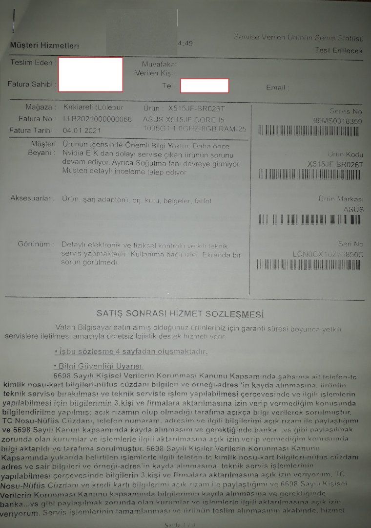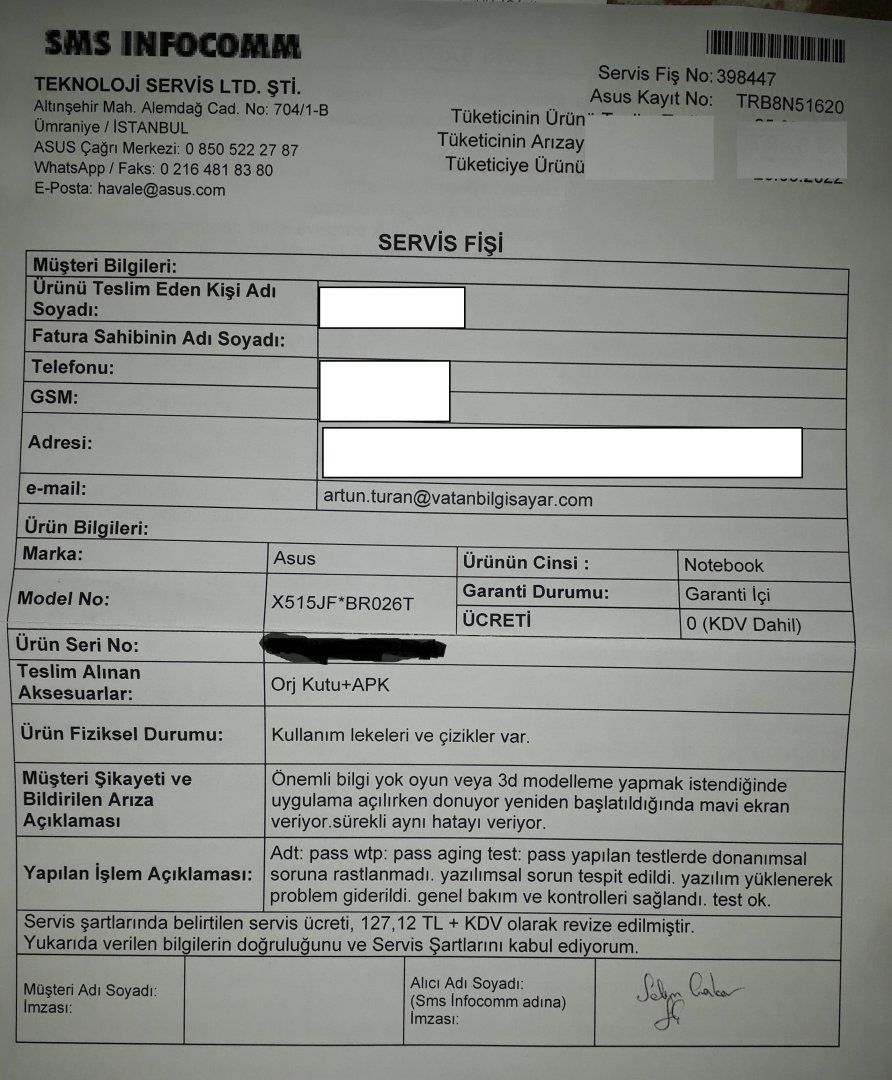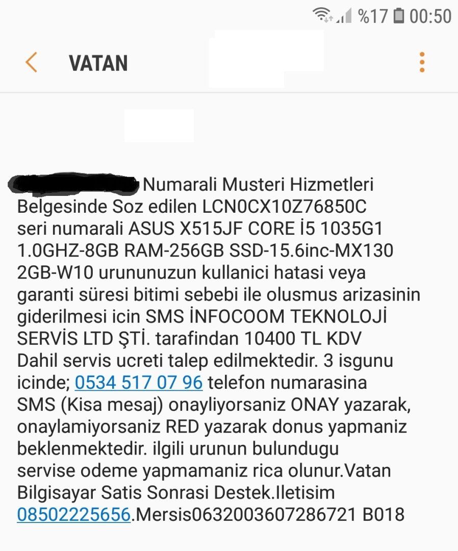Vatan Bilgisayar'dan (2021 Ocak ayında 6816 TL'ye) almış olduğum ASUS dizüstü bilgisayarımın NVIDIA haric ekran kartının çalışmaması nedeniyle (mavi ekran hataları, NVIDIA ekran kartının aygıt sürücüsünde bazen kaybolması) Vatan Bilgisayar'a giderek tamir edilmesini istedim. Bilgisayarım daha 6 ay daha garanti kapsamındaydı. Onlar da ilgili teknik servise yolladılar. 3-4 gün sonra Vatan Bilgisayar'ın beni arayarak bilgisayarımın tamir edildiğini, sorunun yazılımsal kaynaklı olduğunu söylediler. Eve gittiğimde sözde tamir edilmiş bilgisayarım iki saat sonra yine mavi ekran hatası verdi. Yine NVIDIA ekran kartı çalışmamaya başladı. Ertesi gün bunlara ek olarak laptop fanı 90 derecelere çıksa da devreye girmemeye başladı. Isınması sebebiyle doğal olarak laptop kasmaya başladı. 1 gün sonra yine Vatan Bilgisayar'a giderek durumu anlatıp yine aynı sorunların yaşandığını ve laptop fanının çalışmadığını söyledim. Onlar da yine teknik servise yolladılar. Birkaç gün sonra telefonuma teknik servisten rezalet gibi bir mesaj geldi. Mesaj da "ürününüzün kullanıcı hatası veya garanti süresi bitimi sebebi ile oluşmuş arızasının giderilmesi için SMS infocom teknoloji servis LTD şti. Tarafından 10400TL KDV dahil servis ücreti talep edilmektedir." şeklindeydi. Başımdan kaynar sular dökülmesine neden bu mesaj nedeniyle hemen Vatan Bilgisayar'a gittim ve duruma itiraz ettim. Şaka gibiydi. İlk tamirden gelen bilgisayar için yazılımsal kaynaklı sorun denildi. İkinci defa tamire gidildiğinde ise kullanıcı hatası olduğu söyleniyor. Bu utanmazlar bir de tamir için 10400 TL para istiyorlar. Ulan ben bilgisayarımı 6816 TL'ye almışım 10400 TL ne ulan. Neredeyse cinnet geçirecektim. Adamlardaki utanmazlığa bak. Hayır bilgisayarımın ekran kartı hariç çalışıyor hala. Bilgisayarımın çift ekran katı var biri onboard Intel. Sonuç olarak bu işi mahkemeye taşıyacağım. Siz siz olun ASUS'tan hiçbir şey almayın. Bu dolandırıcılara para yedirmeyin!