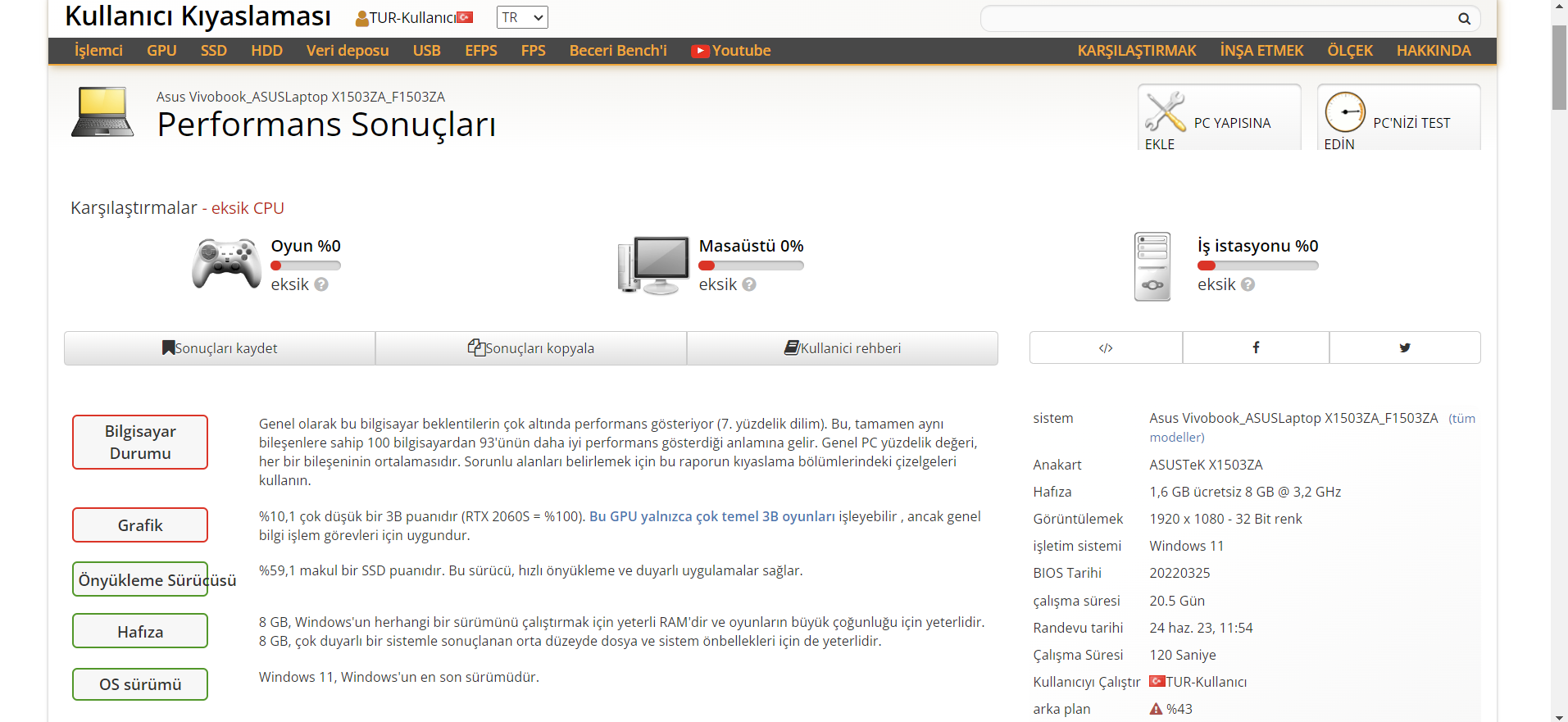 Merhaba, 4 ay önce ASUS Vivobook laptop aldım, ancak şimdi YouTube'da bile hafif kasıyor. Benchmark testi yaptım ve sonuçlarda hepsini yüzde 0 gösterdi. Bu test sonuçları olağan bir durum mudur, sonuçları aldığım yere götürsem garanti kapsamında işlem yaparlar mı?