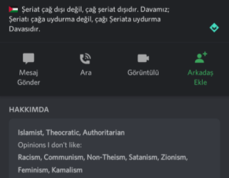 Bunlar ülkenin başındaki şeriatçı, yobazların eseri. Dinle, kitapla kandırılabilecek bu kadar ahmak başka bir millet yoktur sanırım.Arap sevdalıları süslümanlarla boşuna uğraşmışsınız. Türkler İslam sayesinde her geçen zaman daha da araplaşıyor. Discord üzerinde de büyük bir şeriat topluluğu var sanırım. Büyük sunucuları da var kendilerinin. Resmen sanal ortam da tarikatlaşmışlar.