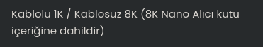 Kablolu 1K / kablosuz 8K (8k nano alıcı kutu içeriğine dahildir).