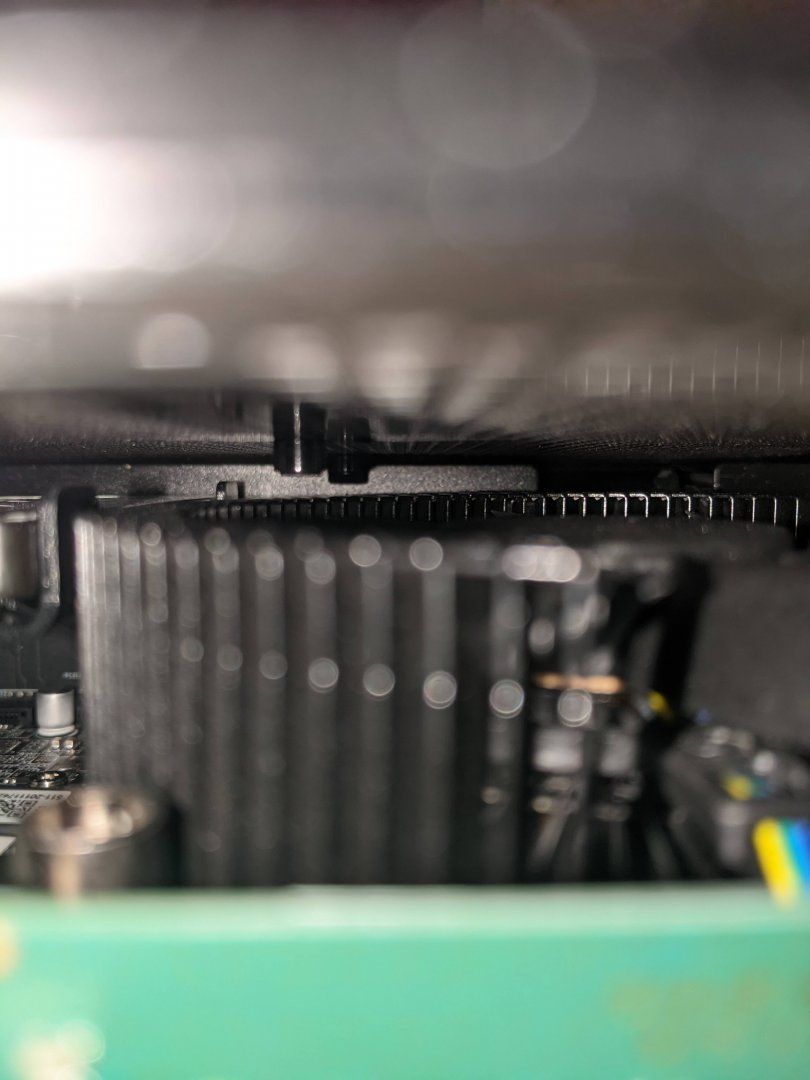 Bu PC'de en sevmediğim ve bu sebeple de 2 yıldız kırdığım tek husus ise oldukça gürültülü bir CPU fanına sahip olması. Sıkıntı şu ki, bu arkadaş bu özel dizayn ITX anakart için neredeyse sıfıra sıfır tasarlanmış bir yapıda olduğundan, piyasadaki başka bir fan ile ikamesi maalesef çok zor. Gerek üstten kasa kapağı ile olan mesafesi, gerekse de VRM'ler ile olan yakınlığı sebebiyle bu tür değişikliğe pek izin vermiyor. Yapı itibarıyla CPU fanı ısı borulu bir soğutucu olmasa da bakır bir yüzeye sahip olması yine de sevindirici.