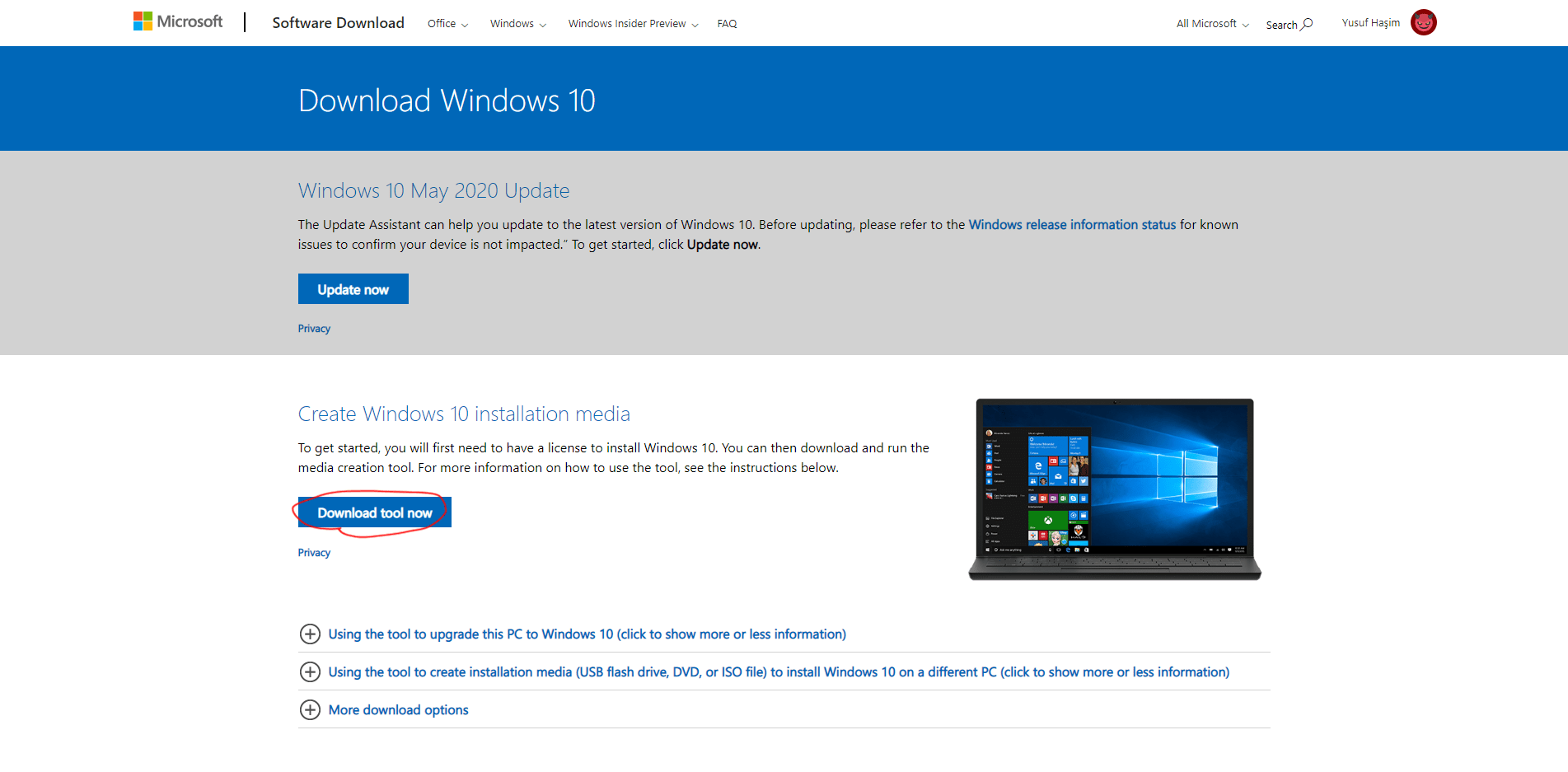 Microsoft'un sitesinden ISO indirmeyi dene;