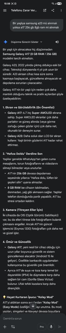 Bu A17 biraz pahalı onun için A23 yazdım. A23 Kullandık android 14 iyidir.Alınmaz. Güncelleme almayacak artık ve ömrü kısa. A17 alsın. Yukarıda linkini verdim.