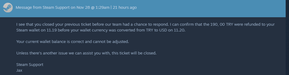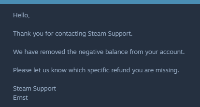 Steam, Türk lirası'ndan Dolar'a geçtiğinde, hesabımın bakiyesi -21 dolar oldu ve bu sırada bekleyen bir iadem vardı. İadem gerçekleştiğinde, -21 dolarlık bakiye -15 dolara düştü ve ben de Steam desteğe yazdım. Steam destek ekibi, bu -15 dolarlık bakiyeyi sildi, ancak iadem de bu eksi bakiyeyle birlikte silindi. Defalarca yazmama rağmen, hala bakiyemin doğru olduğunu iddia ediyorlar ve saçma cevaplar veriyorlar.