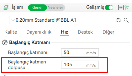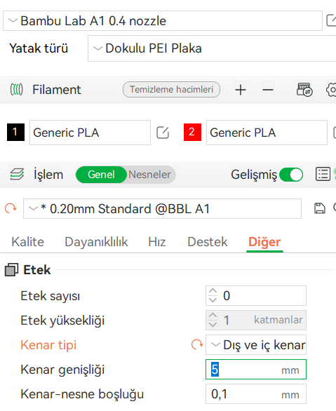 Diğer kısmından gösterdiğim ayarı yapın fakat kenar genişliği kısmını kendiniz deneyerek istediğiniz boyutta genişletebilirsiniz. Yapıştırıcı olarak İstanbul filamentin yapıştırıcısını kullanıyorum memnunum. İlk sorduğunuz soruyu anlayamadığım için uzun uzun yazdım kusura bakmayın.