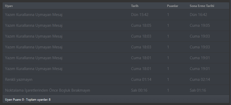 Ben genelde çok hızlı yazı yazıyorum. Ve yazdığım mesajı tekrar kontrol ediyorum. Özellikle bu sitede. Yine de aşırı sinir bozucu bir şekilde uyarılar üst üste geliyor. Yanlış anlamayın ve üzerinize alınmayın ama geçen gece Windows 10'un sağ alt kısmında bilgisayarım 1 dakikada 5-6 kere ötüp uyarı aldınız dedi. Küfür ederek Chrome ayarlarından technopat.net'i engelledim. Ban sisteminin gerçekten düzenlenmesi lazım. Bu kadar insan boşuna şikayet ediyor olamaz: