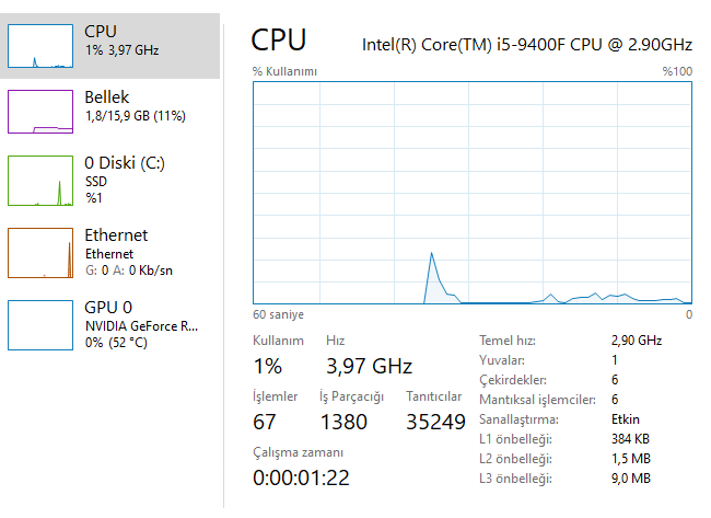 İşlemlerde gördüğüm en iyi sayı 62 oldu. CPU %3 üstünü görmüyor. (O Spike görev yöneticisini açarken oldu)