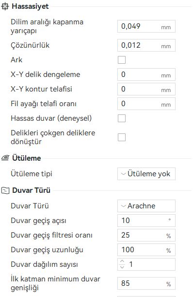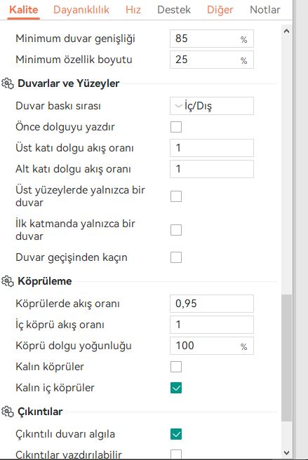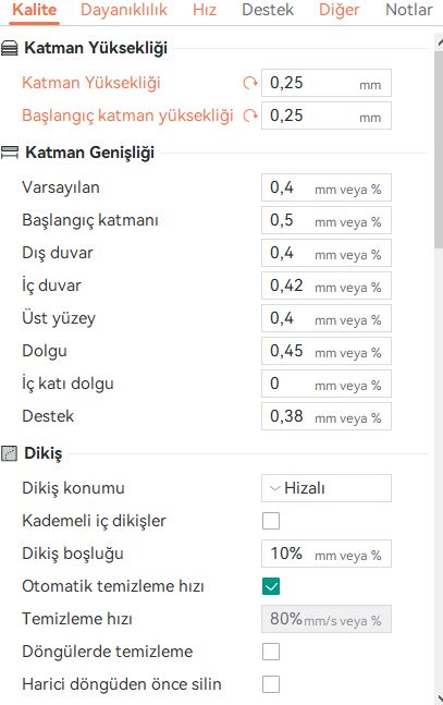 Sonrasında tekrar baskı almak istedim bu sefer tasarımın STL dosyasını indirdim ve tasarımcısının belirttiği ayarlara göre baskı almak istedim ama onda da baskı esnasında katmanlarda sıkıntı oldu ve baskı bozuldu bende durdurdum. Tasarımcısının önerdiği ayarlara ve benim seçtiğim ayarlara alttaki resimlerden ulaşabilirsiniz. Nerede hata yapmış olabilirim? Neler yaparsam daha iyi olur?