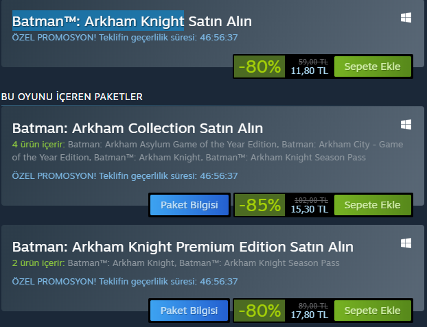 Steam'de Batman™: Arkham Knight indirime girdi ve almayı düşünüyorum fakat iki tane paket var. Bu paketlerden hangisini almalıyım? Anladığım kadarıyla üstteki paket alttaki paketteki şeyleri de içeriyor ve daha ucuz.