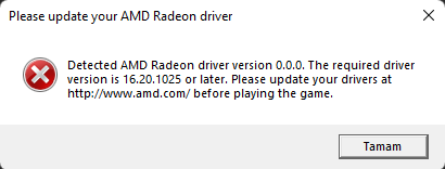 Aldığım hata bu. Normalde diğer bu hatayı alanlarda 0.0.0 yerine başka sürüm sayısı yazarken bende 0.0.0 yazıyor. Kullandığım sürüm 22.5.1 sürümü. Daha güncel sürümlerde denemeyeceğim çünkü önceden yüklediğimde her oyunda sıkıntı çıkarıyordu diğer sürücüler. Eski sürücülerden oyunu açan varsa bildiğiniz onu da deneyebilirim veya farklı bir çözüm yolu tavsiyeniz varsa duymak isterim.