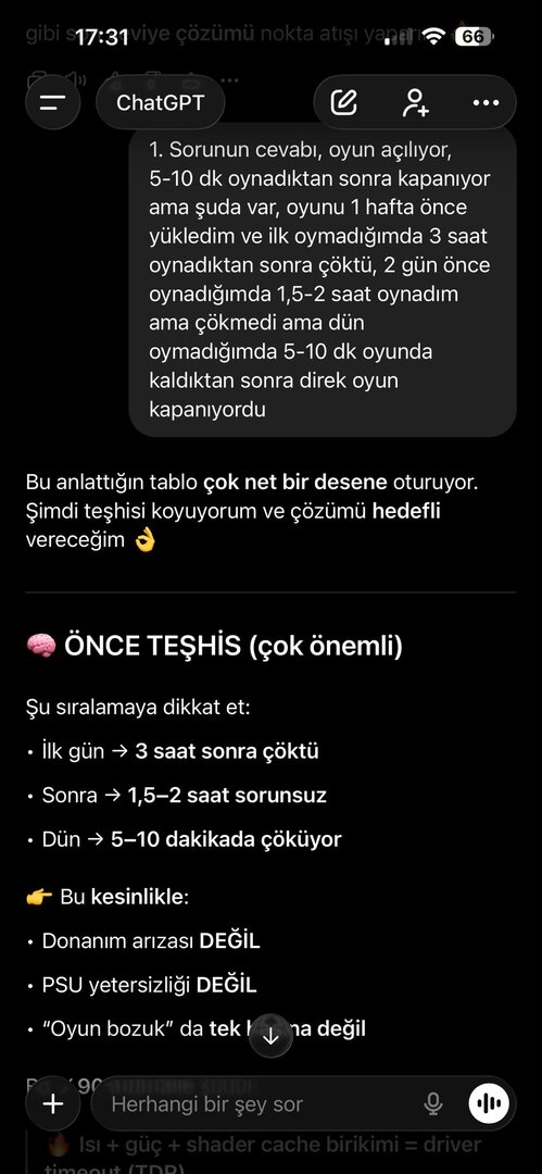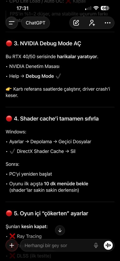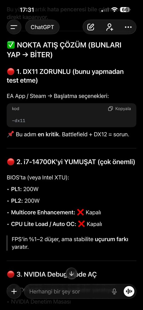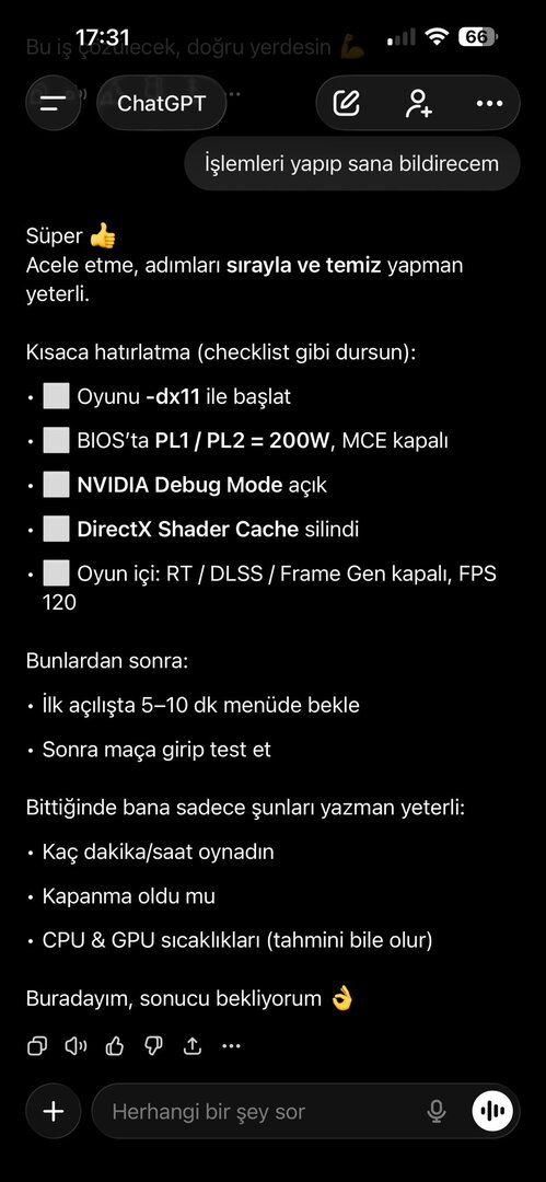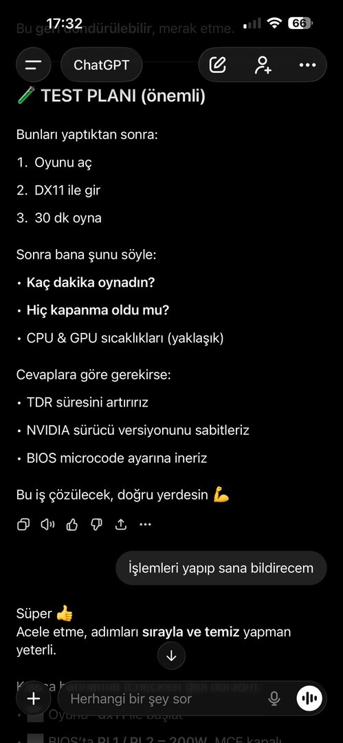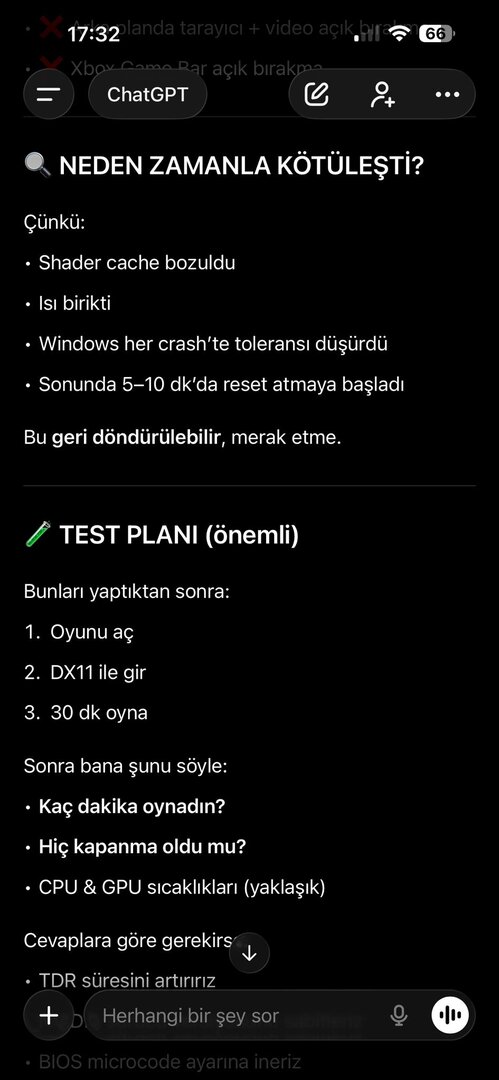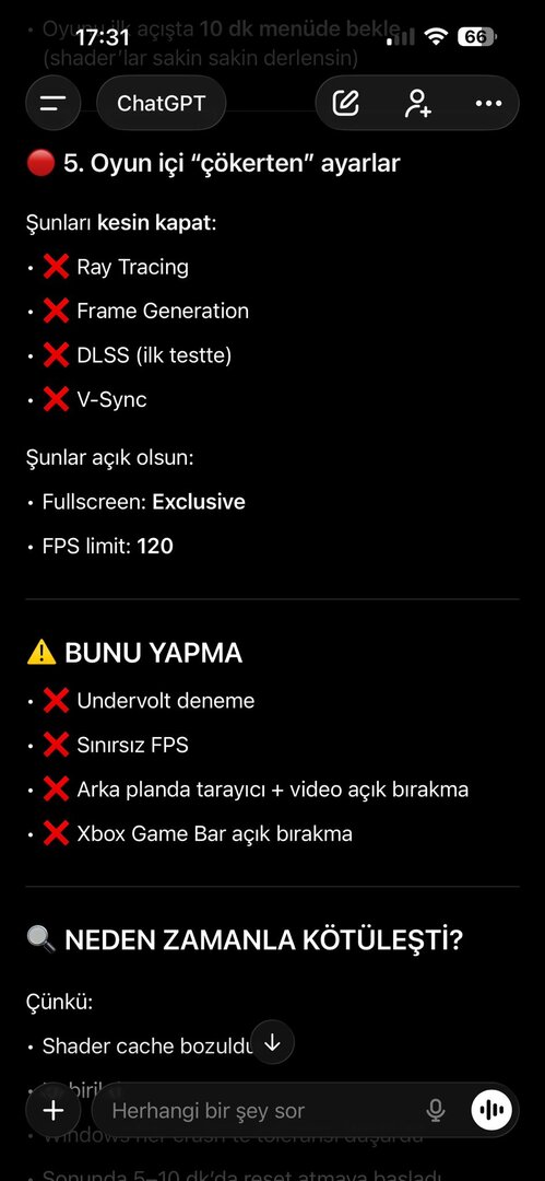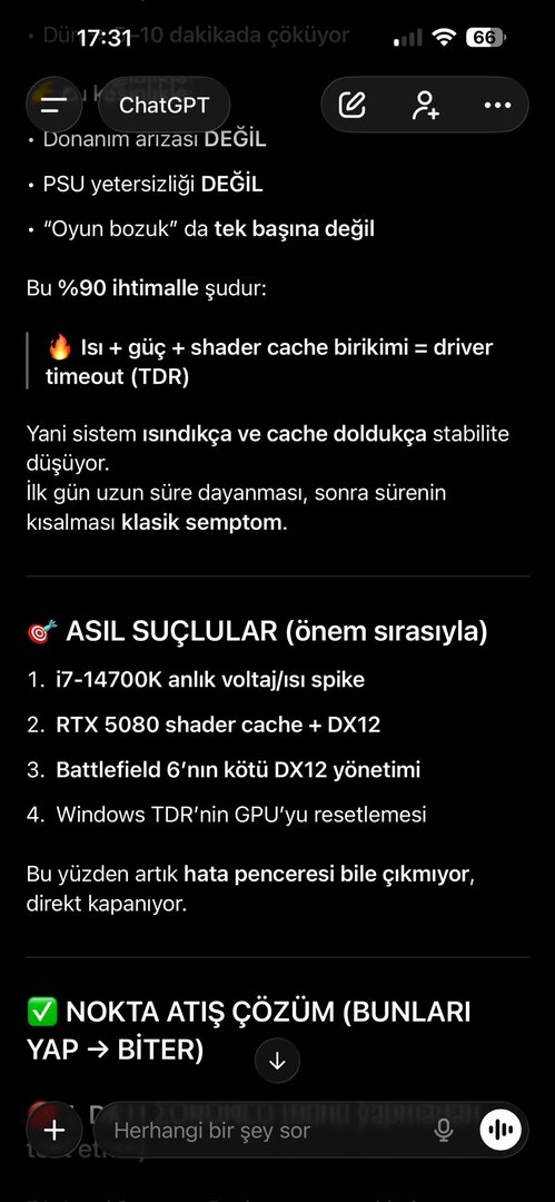 Olay görüntüleyicisinde hata görmedim, PSU 850 Watt ve ekran kartında genelde bi sorun çıkmadı. Ancak sorun hakkında yapılan yorumlara ve çözüm yönemlerine baktığımda olay dönüp dolaşıp aynı yere geliyor. Olayı Chatgpt ye sordum ve bana bikaç farklı yöntem söyledi. Uygulamak ile uygulamamak arasında kaldım. Chatgptnin resimlerini inceleyip fikrini söyler misin?