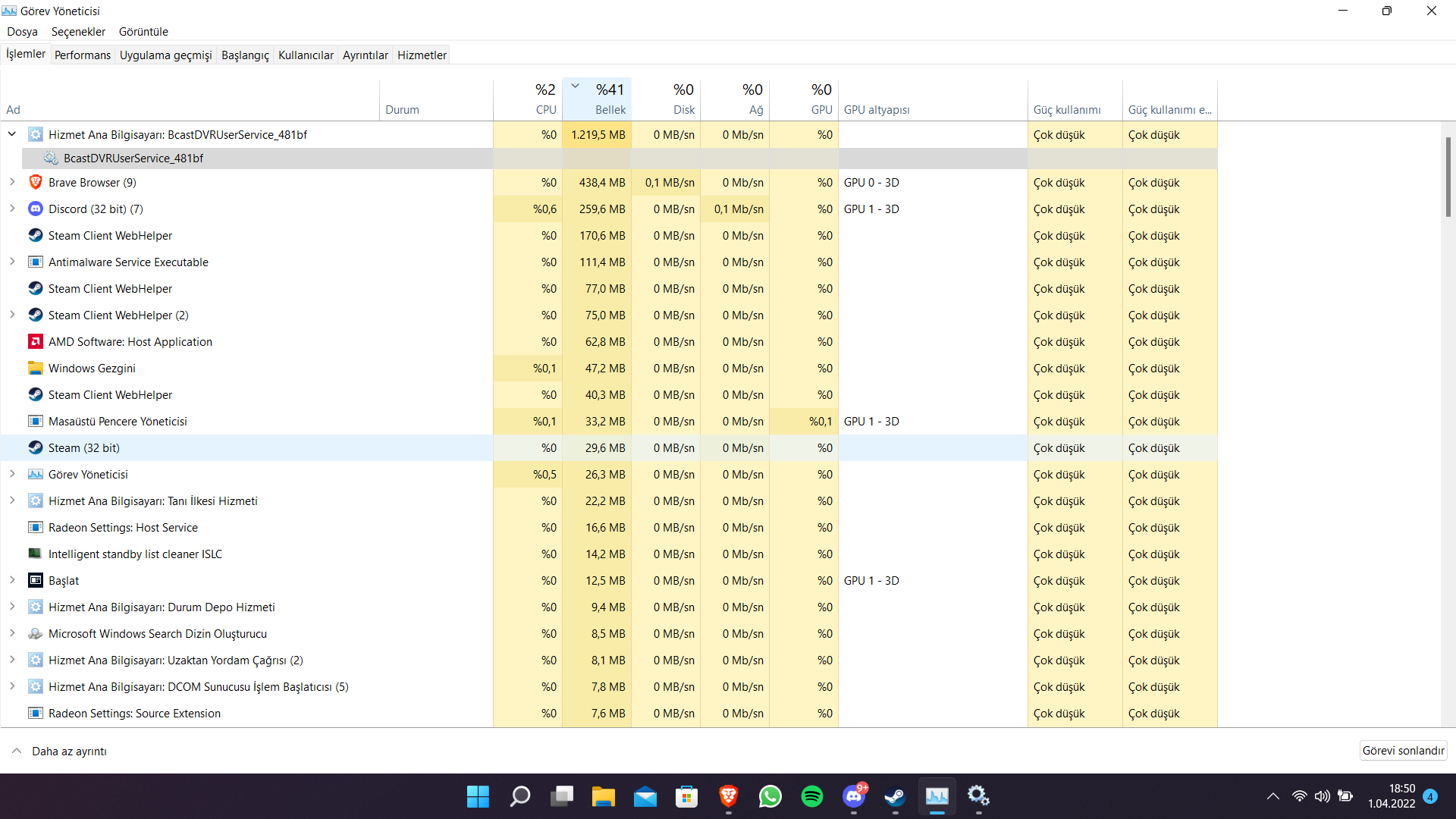 Merhaba iyi forumlar bugün birkaç şey indirip silmem sonucunda resimlerde de görüldüğü gibi "BcastDVRUserService 481bf" adlı bir şey çalışıyor ve bu hatrı sayılır bir miktarda RAM kullanıyor. Kapatıp görevi sonlandır diyorum bir süre sonra tekrar çalışıyor. Bu virüs mü nedir anlamadım. Bugün karşılaştım bununla önceden hiç görmedim, yoktu da yani bu sıkıntıyı nasıl çözebilirim? Yani bu neyse nasıl kapatabilirim?