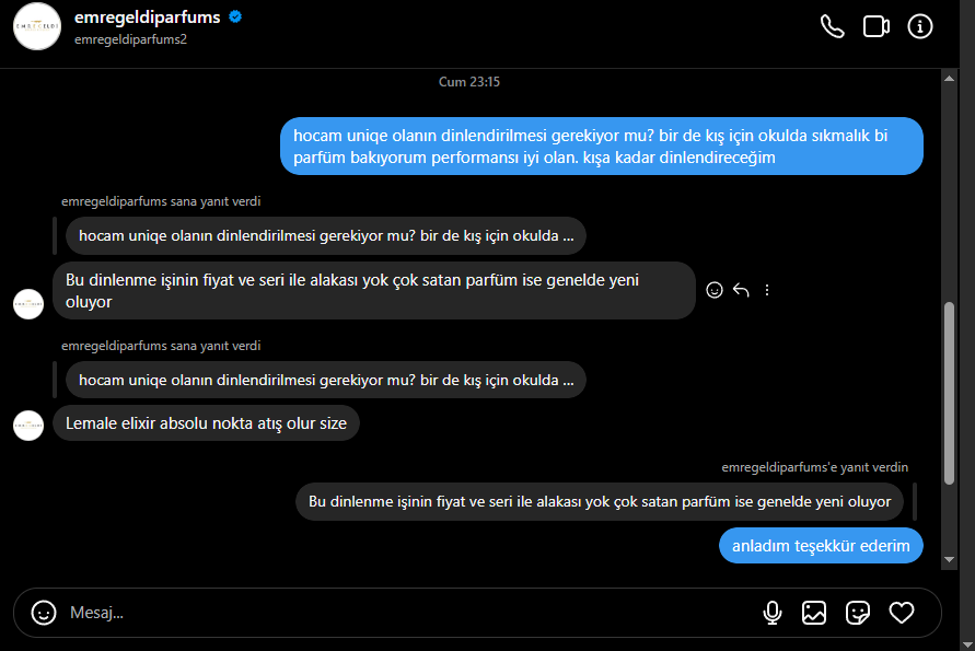 Hocam 1 haftadan fazla olmuş unutmuşum biraz. Ayrıca bu parfümlerin dinlenmesi gerektiği için araya bir de kış parfümü alıp hiç sıkmadan aylarca dinlendirmek istiyorum siz de öyle yapabilirsiniz performansı harika olur muhtemelen.