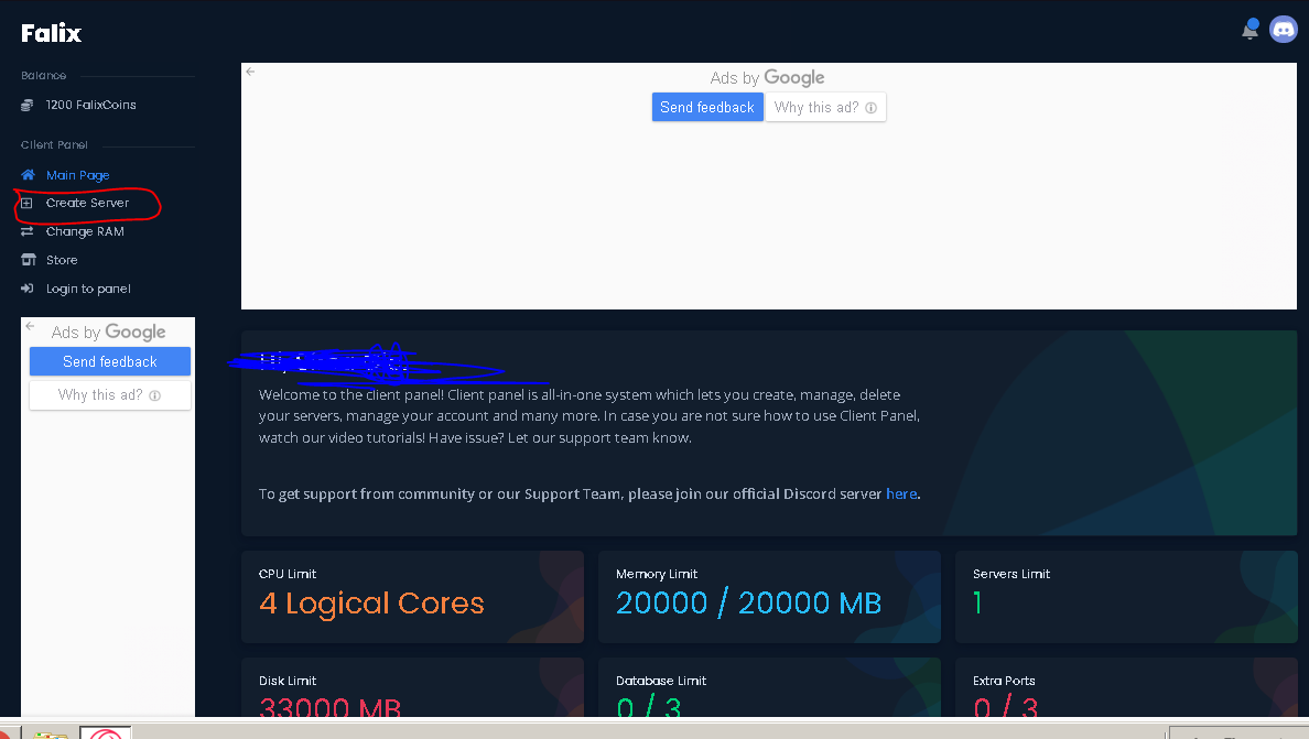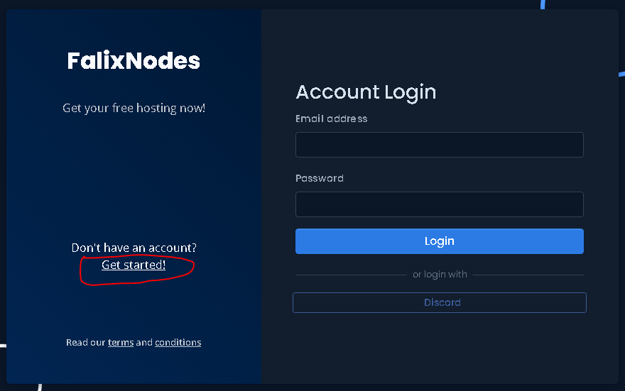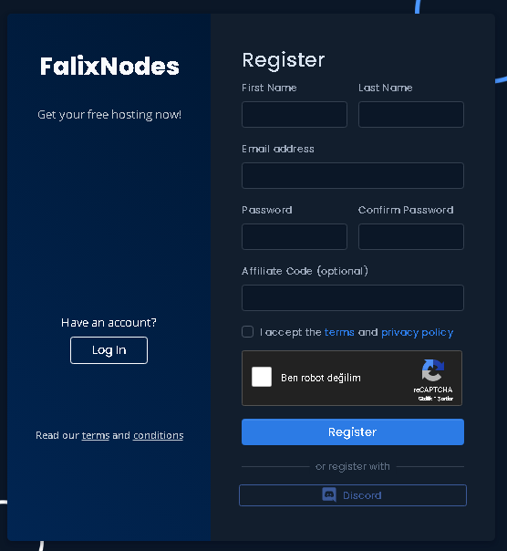 İlk olarak verdiğim siteye giriş yapıyoruz; https://client.falixnodes.net