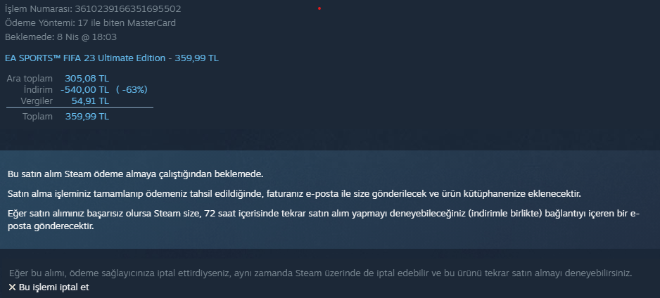 Stamden FIFA 23 Ultimate sürümü aldım ancak 'bu satın alım Steam ödeme almaya çalıştığından beklemede.' yazısı geldi.