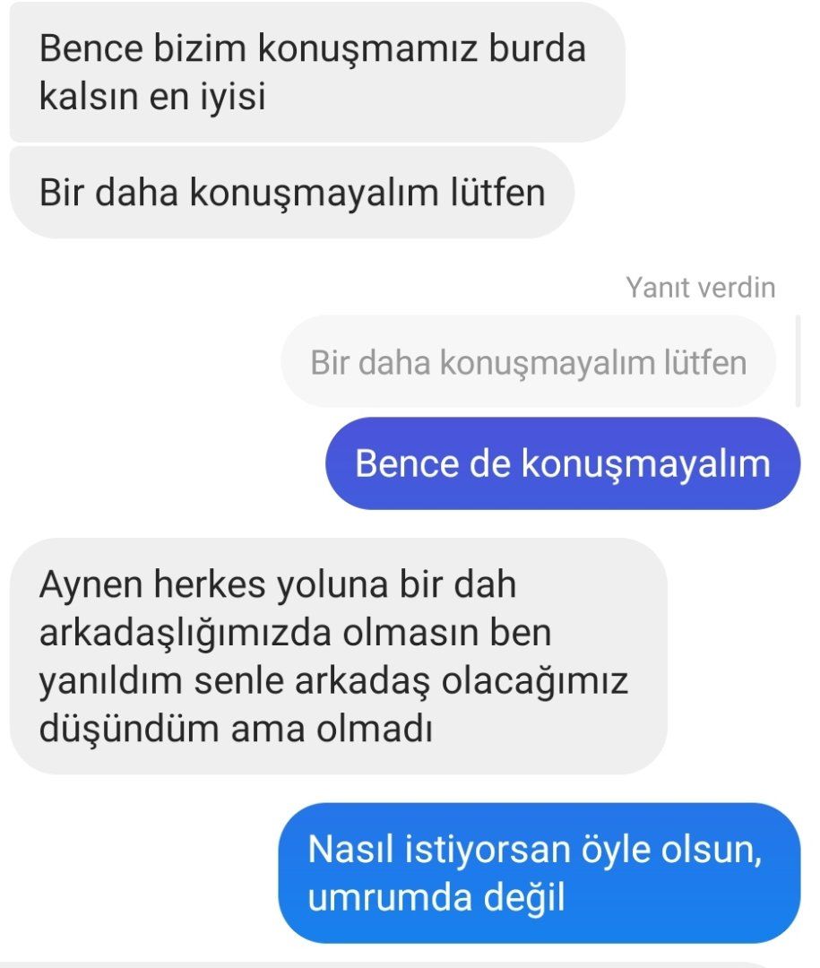 Bende senin yaptığın çok büyük ayıp falan dedim aklınca ondan özür dileyeceğimi sanıyordu, bugünde umurumda değilsin bir daha hiçbir konuda benimle muhatap olma falan dedim yol verdim.