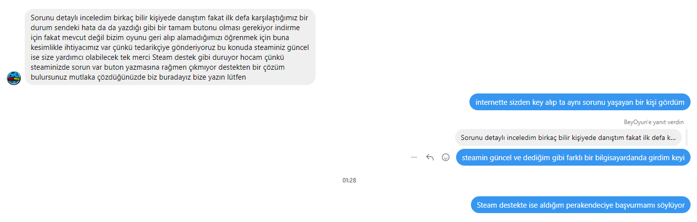 Dün bey oyun adında bir Instagram hesabından en az 150 TL'lik oyunların olduğu bir listeli key aldım 4 adet. Keylerin fiyatı 60 TL'idi eğer ki sizde olan oyunlar keyden çıkarsa oyunun fiyatının 100 TL altına iade alıyorlar. Bu 4 keyden üçünde bir sorun yaşamadım fakat son keyi açarken resimde gördüğünüz hatayı aldım bunu Instagram'dan kendilerine ilettiğimde ise bana ilk defa karşılaştıkları bir durum olduklarını söylediler. Sorunun benim Steam hesabımda olduğunu ve eğer ki çözüm bulabilirsem kendilerine başvurmamı söylediler. Steam'de ise CD key ile ilgili olan tüm sorunlarda satıcıya başvurmamın gerektiği yazıyor aynı keyi başka bir bilgisayardan denediğimi ve aynı hatayı aldığımı kendilerine önceden de söyledim. Böyle key satış sitelerinden aslan alışveriş yapmayın.