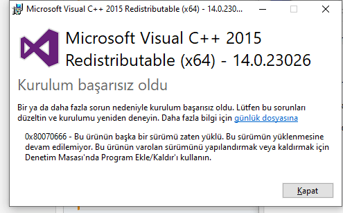 C:\Windows\System32\msvcr120.dllC:\Windows\System32\msvcp120.dllSildim söylediğiniz dosyaları da indirdim. Kurulum yaparken fotoğrafta görünen hatayı veriyor. Diğer kurumlarda da aynı hatayı verdiSilin: