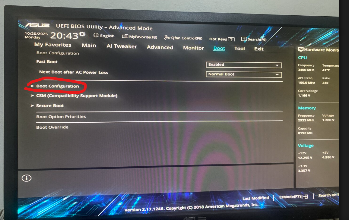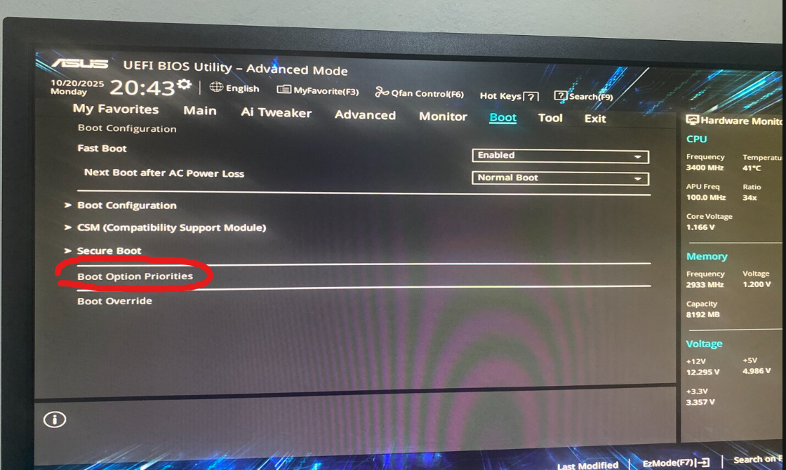 Advanced moda geç. Boot options kısmından 1. sıraya Windows'un yüklü olduğu SSD'yi seç.