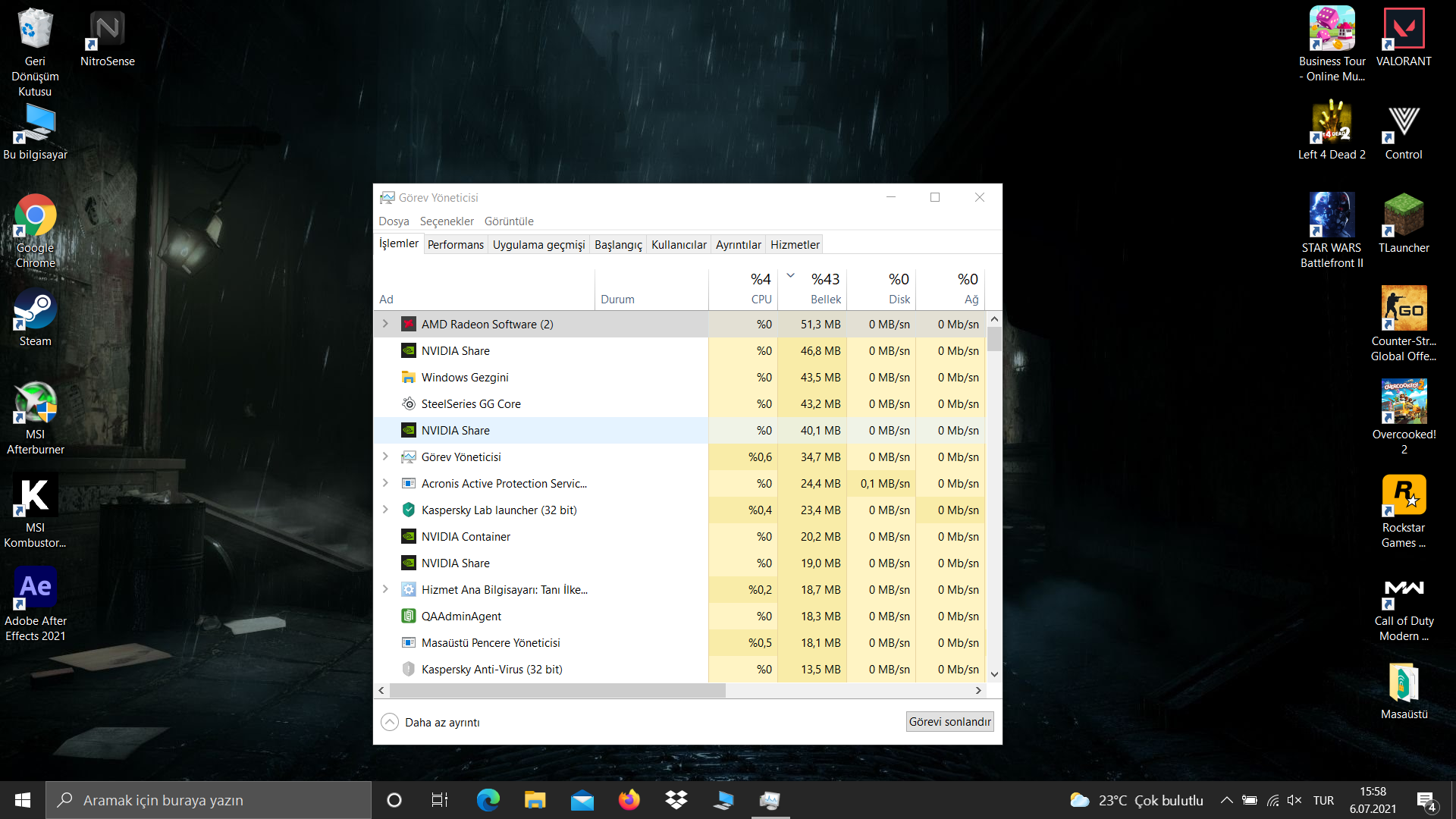 Hocam tamam tamamen boşta olmayabilir ama bunları kapattığımdada çok bi değişim olmuyor,çoğunun kullanımı 10 ila 50 arası zaten.Sistem boşta değil. Arkada Radeon Software, NVIDIA paylaşım programı, Kaspersky, dosya gezgini, qaadminagent diye bir program çalışıyor.