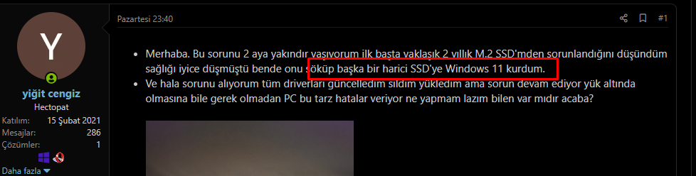 • Merhaba. Bu sorunu 2 aya yakındır yaşıyorum ilk başta yaklaşık 2 yıllık M.2 SSD'mden sorunlandığını düşündüm sağlığı iyice düşmüştü bende onu söküp başka bir harici SSD'ye Windows 11 kurdum.