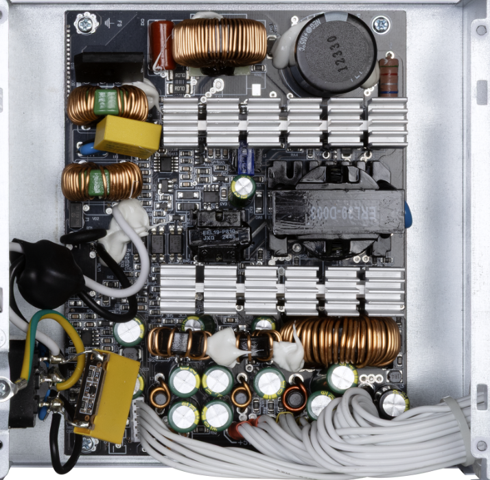 BitFenix bpab 750W veya 850W modeli bu şekilde. Kasanın içinde bu model olması lazım. 2 aşamalı yapmışlar. 1 adet sigorta, 1 adet mov, 2 adet common chocke bobin, 2 adet X kapasitörü ve 4 adet y kapasitörü kullanılmış. Ntc sağdaki mavi şey sanırım fakat tam emin olamadım.