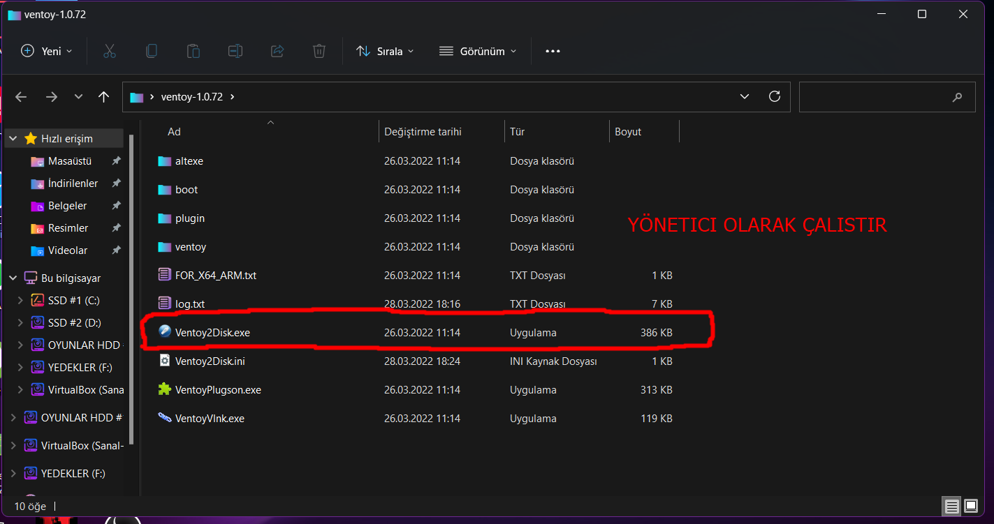 Daha sonrasında masaüstüne Ventoy klasörünü çıkarıp, içine girip Ventoy2Disk'i yönetici olarak çalıştıracağız.