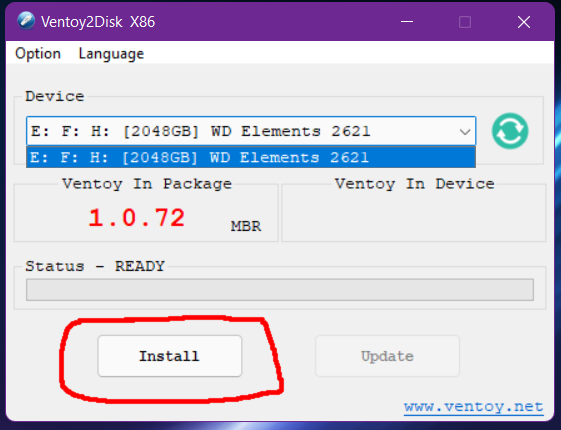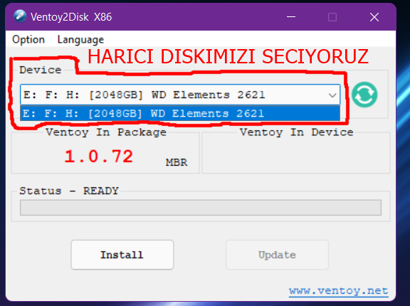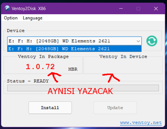 İşlem bittikten sonra Ventoy'ın device bölümünde sol taraftaki versiyon kodunun aynısı yazacaktır.