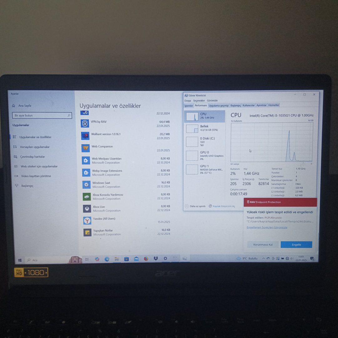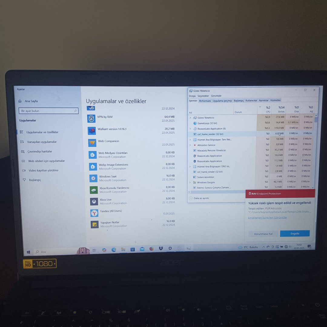 Evet şu an internetten bir EXE yüklemiştim oyundu aslında fakat accept accept diye geçe geçe indirdim ortada oyun yok ama farklı uygulamalar inmiş normalde sessizdir fanı bilgisayarın ama ara sıra bayağı ses çıkarıyor internet baglantısını kestim uygulamalara bakmak gerekirse bayağı bilmedigim uygulama var gorev yöneticisine girince GPU %100'den azaliyor ama cikinca geri fazla kullanıyor interneti kesince azaldı GPU kullanımı. Garip uygulamalar şunlar(uygulama kaldırdan bakıyorum 22 Ocakta inmişlere): Altrustics, onebrowser, rav endpoint protection, safer web, VPN by rav, Walliant version, web companion bir de Avast Security browser vardı onu silebildim ama Altrusticside silmeye calisriken rav programi yuksek riskli islem tespit edlidi diye bildirim yolladi şu an hala duruyor hiçbir şeye basmıyorum daha fazla virus gelir diye engelle ve korumasız kal diye tuslar var şu an ne yapmaliyim son durumu SS atacağım.