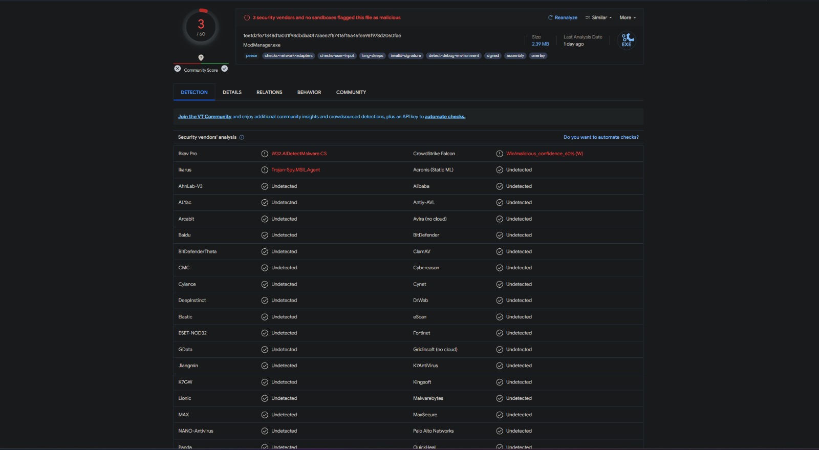 Ayrica RDR2 icin Türkçe yama ve bazi modlar kullanıyorum. Modmanager diye bir dosyayi tarattim ve şöyle bir sonuç elde ettim bunu da yorumlarsaniz iyi olur. Tek soru işareti olarak görülen yazilim bu olabilir bilgisayarda.