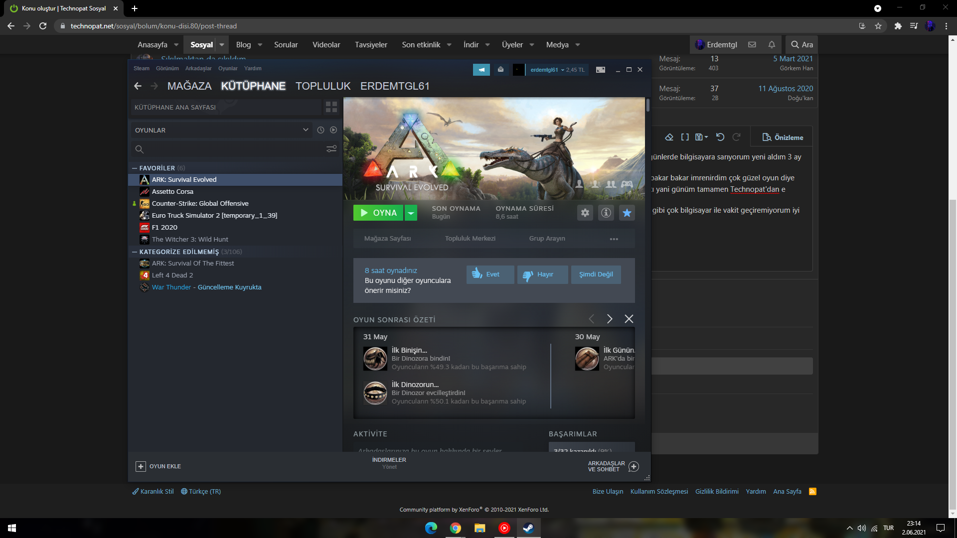 Farklı oyunlar indirdim mesela F1 izleyen birisi olduğum için F1 2020 aldım 2.5 saat oynadım duruyor öyle. en son Ark aldım kuzenim oynardı 2 sene önce bakar bakar imrenirdim çok güzel oyun diye tabii hiç öyle PC olmadı ki