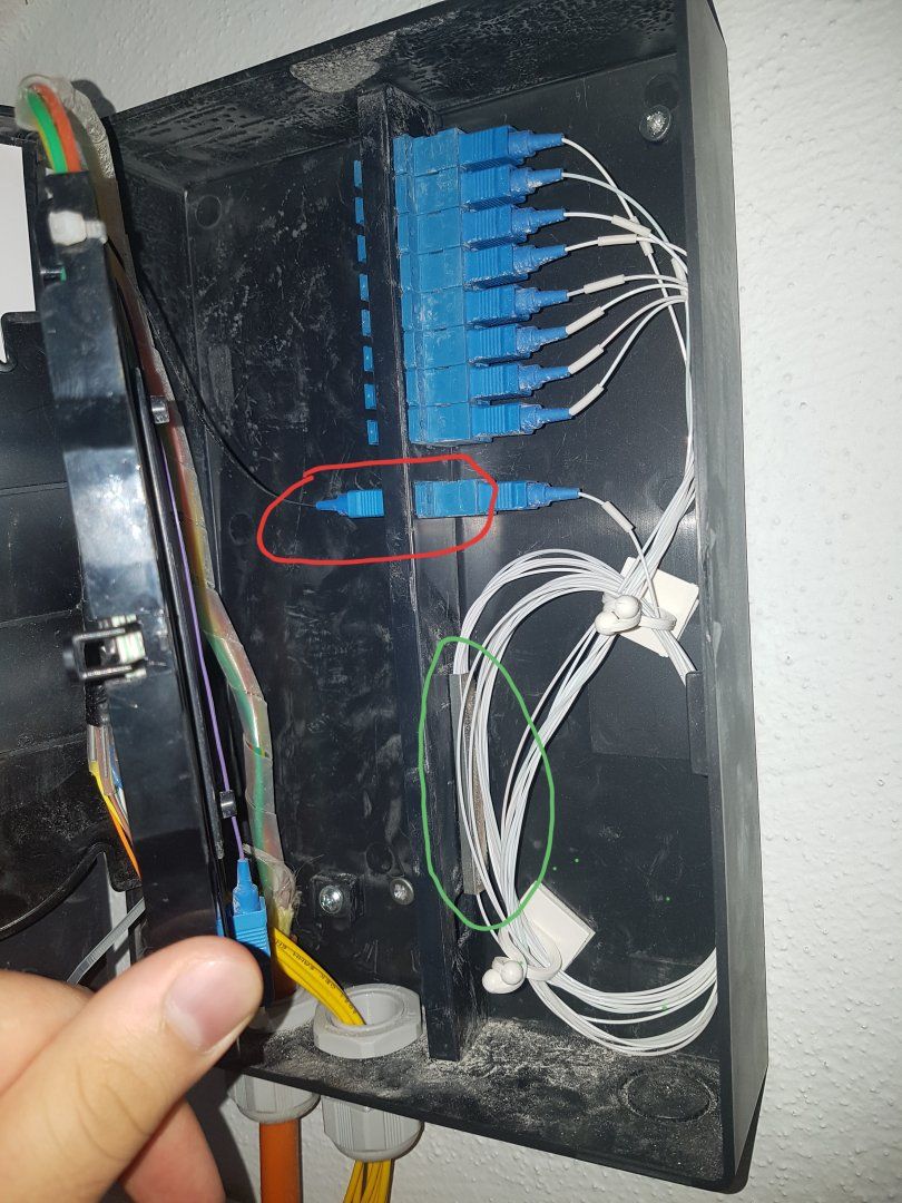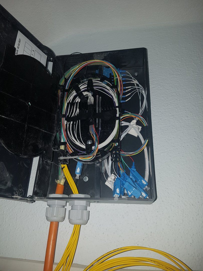 Aşağıdaki fotoğrafta da görüldüğü üzere dairelerden gelen Obk'lar renkli kablolara füzyonlanmış (kaynatılmış). Bu renkli kabloların ucundaki mavi konnektörler sağ bölmede yer alan beyaz kabloların ucundaki mavi portlara takılacak: